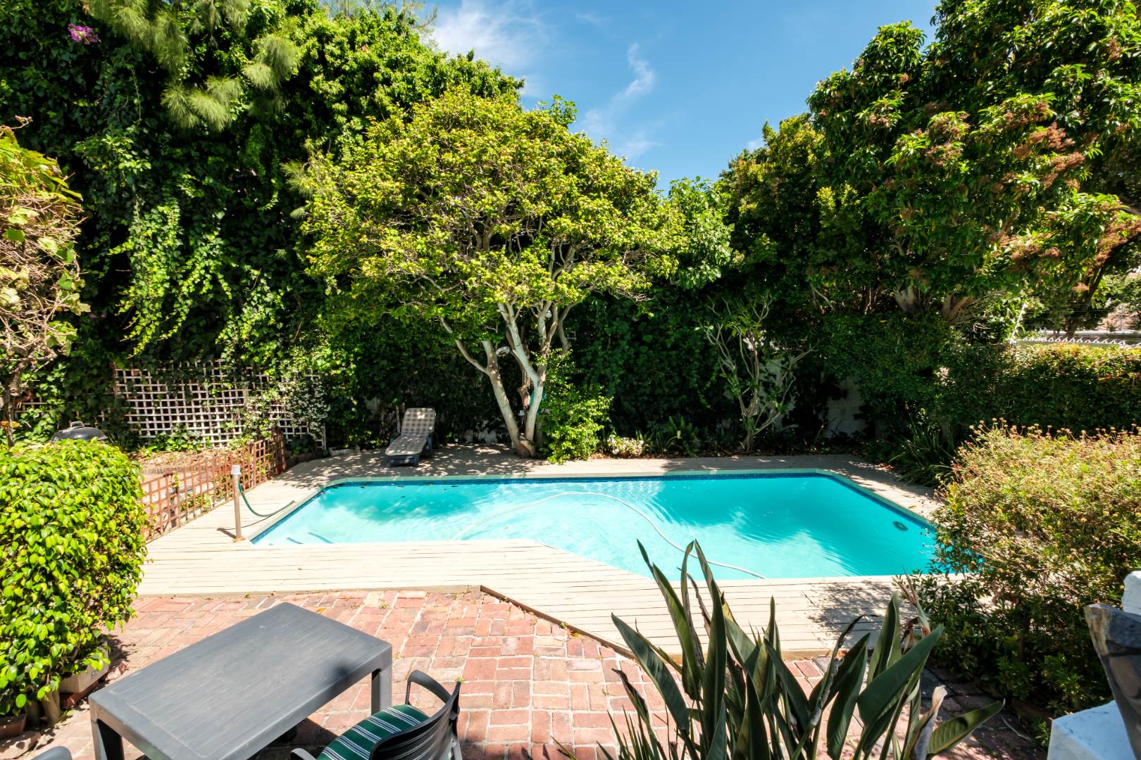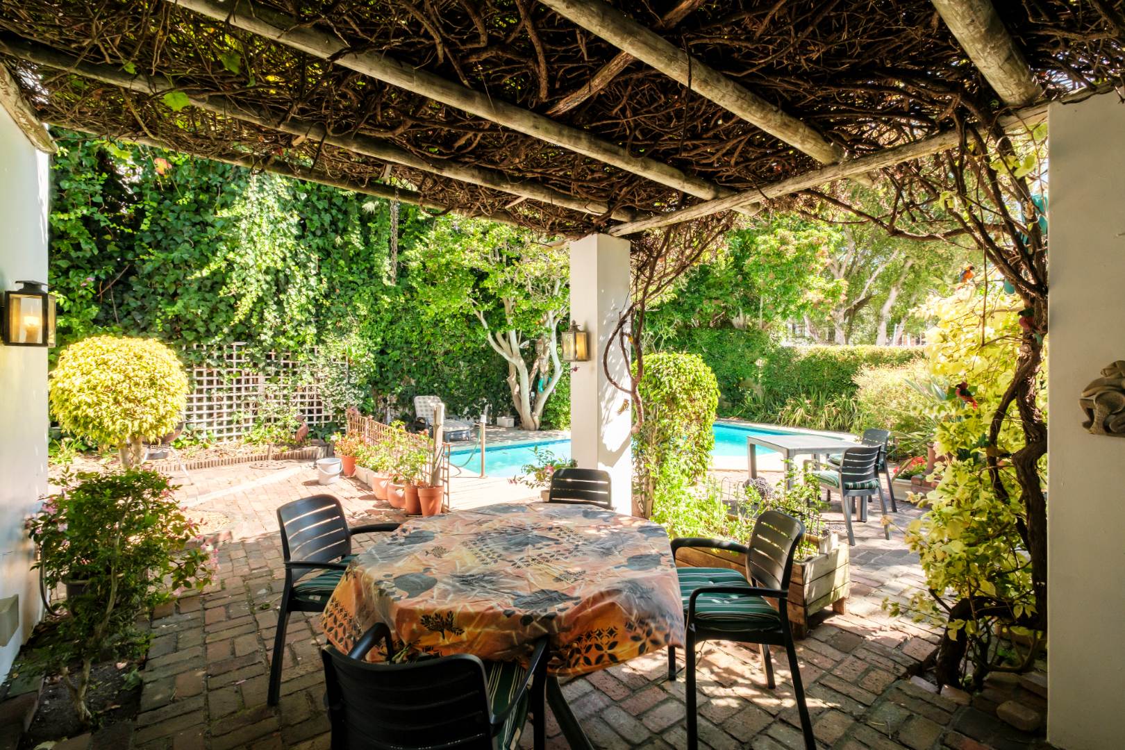 The expansive outdoor area is a true highlight, featuring a large, inviting swimming pool bordered by a wooden deck, perfect for relaxation and recreation. Adjacent to this, a spacious brick patio provides ample room for outdoor dining and entertaining, complemented by a dedicated outdoor barbecue/fireplace. A charming covered seating area with a vine-covered trellis adds to the allure, ideal for enjoying Cape Town's pleasant climate.