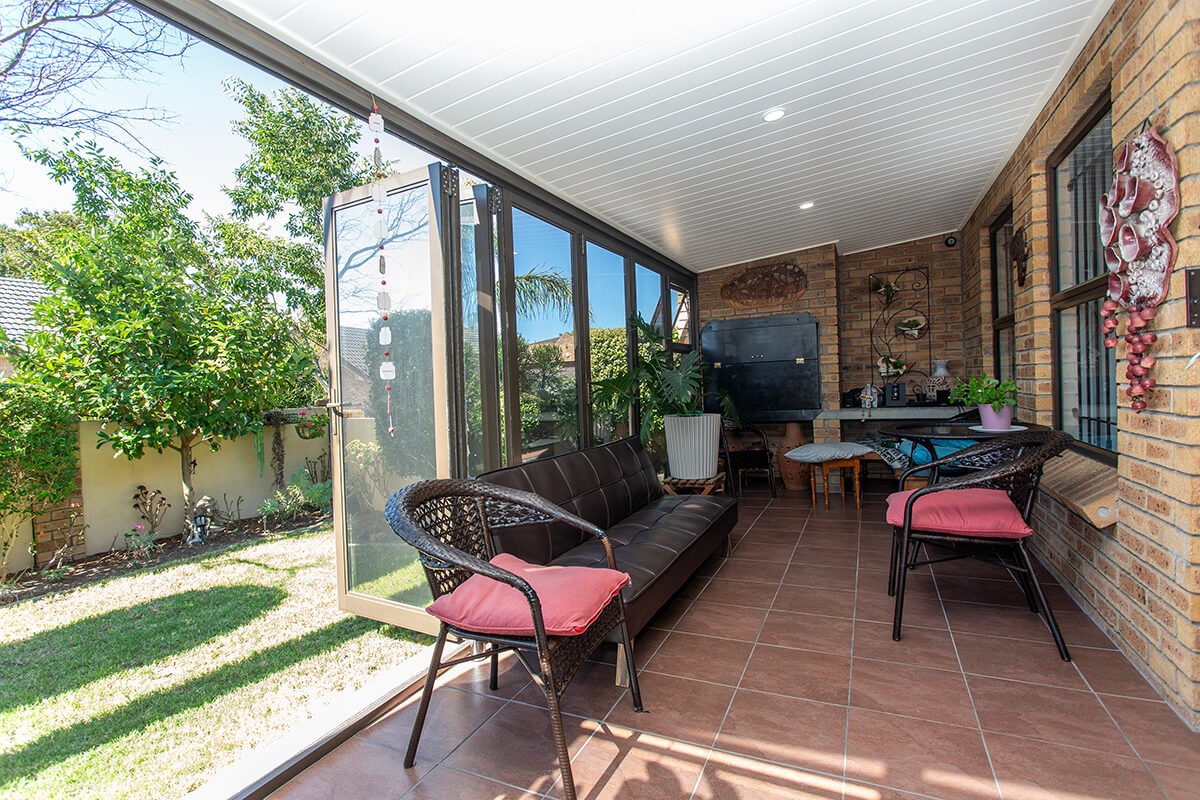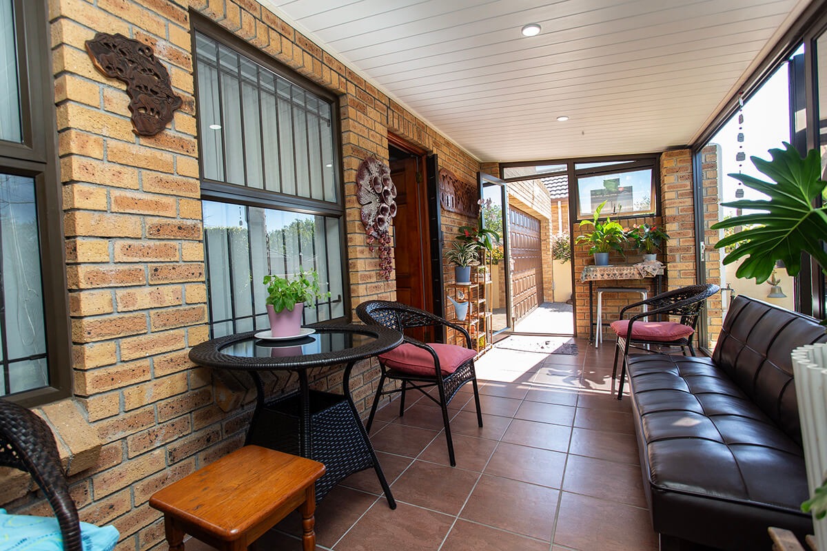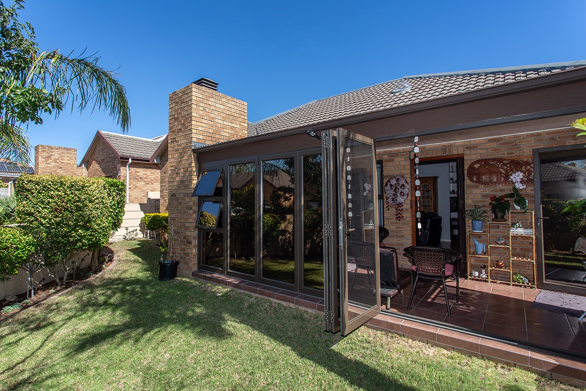 Inside, the home offers a comfortable layout featuring a lounge, a dining room, and a well-appointed kitchen. A highlight is the bright, enclosed sunroom or patio, with build in braai, equipped with large glass doors that seamlessly connect to the private garden, promoting an inviting indoor-outdoor lifestyle, for winter and summer. This versatile space, along with a dedicated braai room, provides options for relaxation and entertaining, enhanced by tiled flooring and air conditioning.
