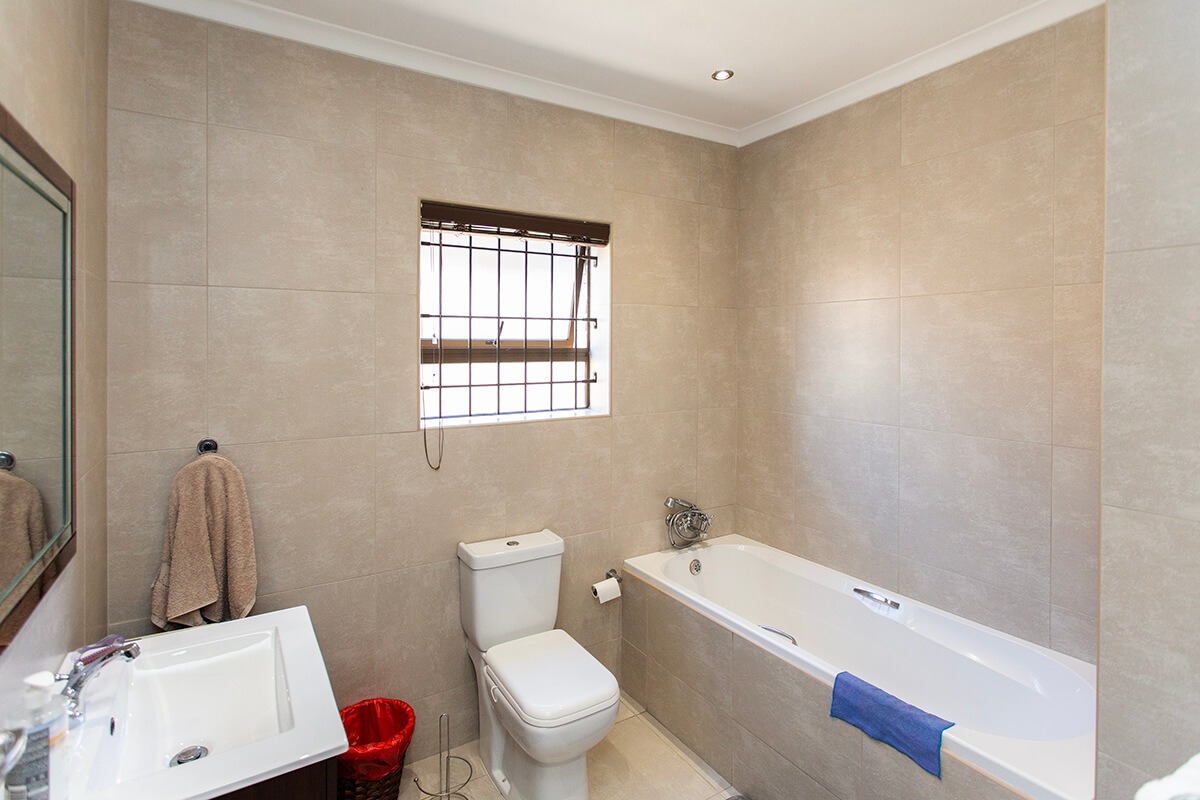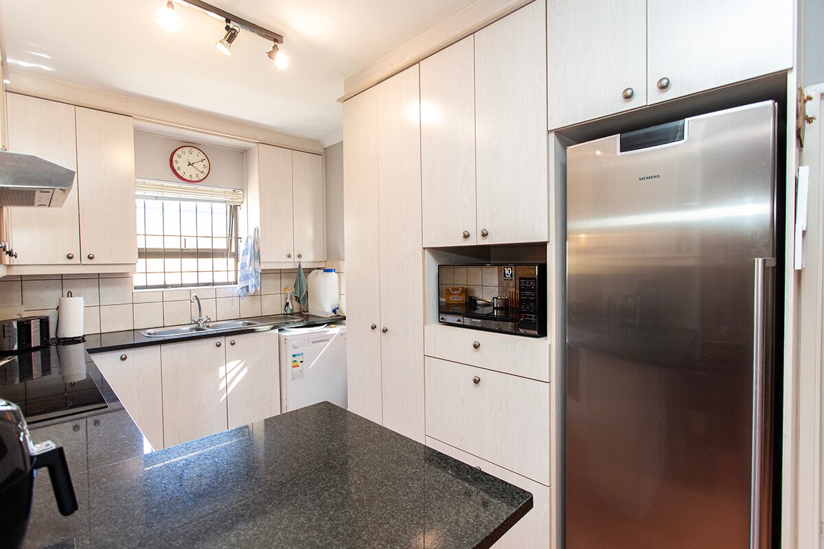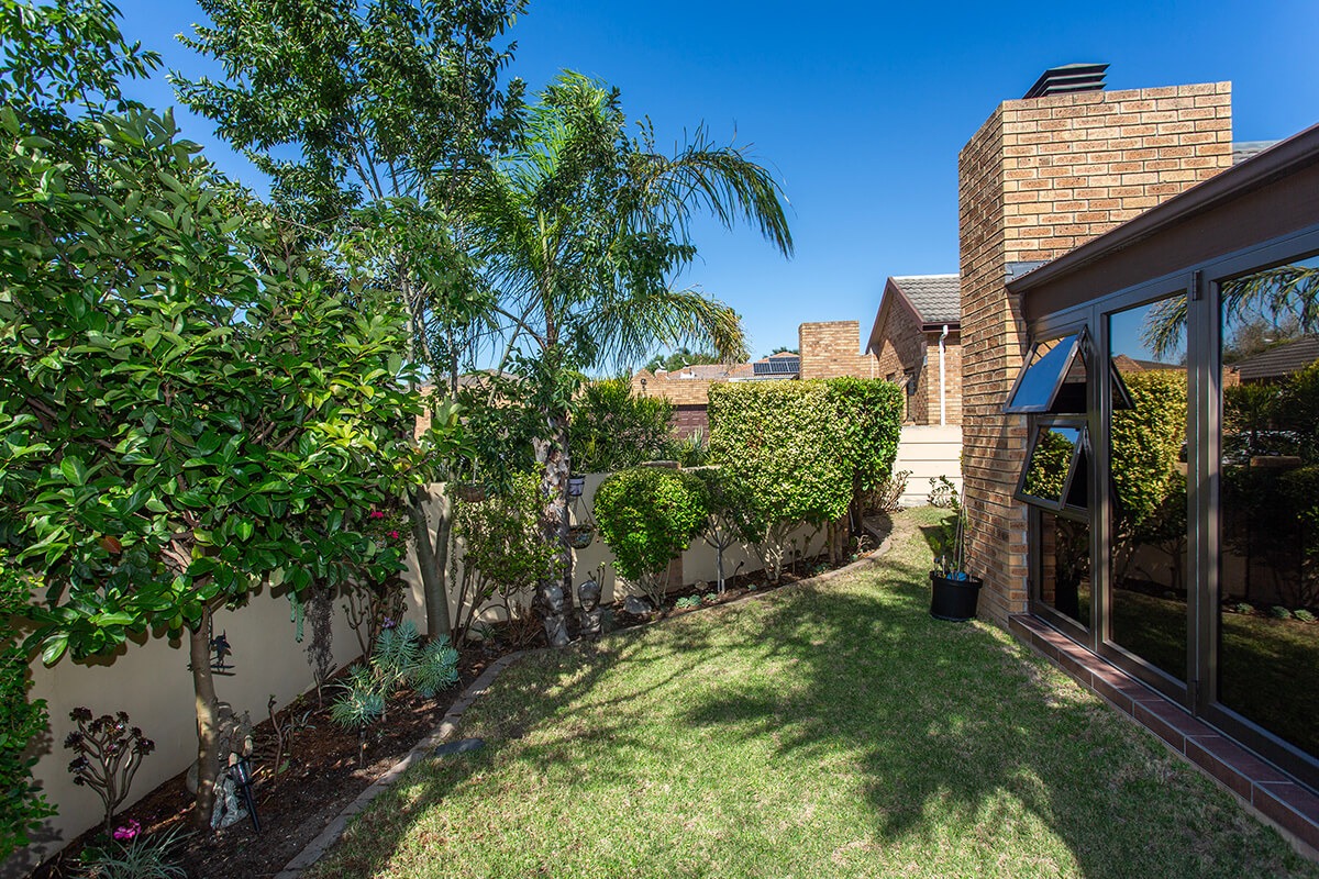 The three bedrooms are thoughtfully designed, with one featuring an ensuite bathroom, ensuring privacy and convenience. The property's 148 sqm floor size on a 285 sqm erf provides ample living space. Outdoor living is a delight with a compact, manicured garden. A double garage offers secure parking. Security features include burglar bars and a security gate, contributing to peace of mind within the complex.