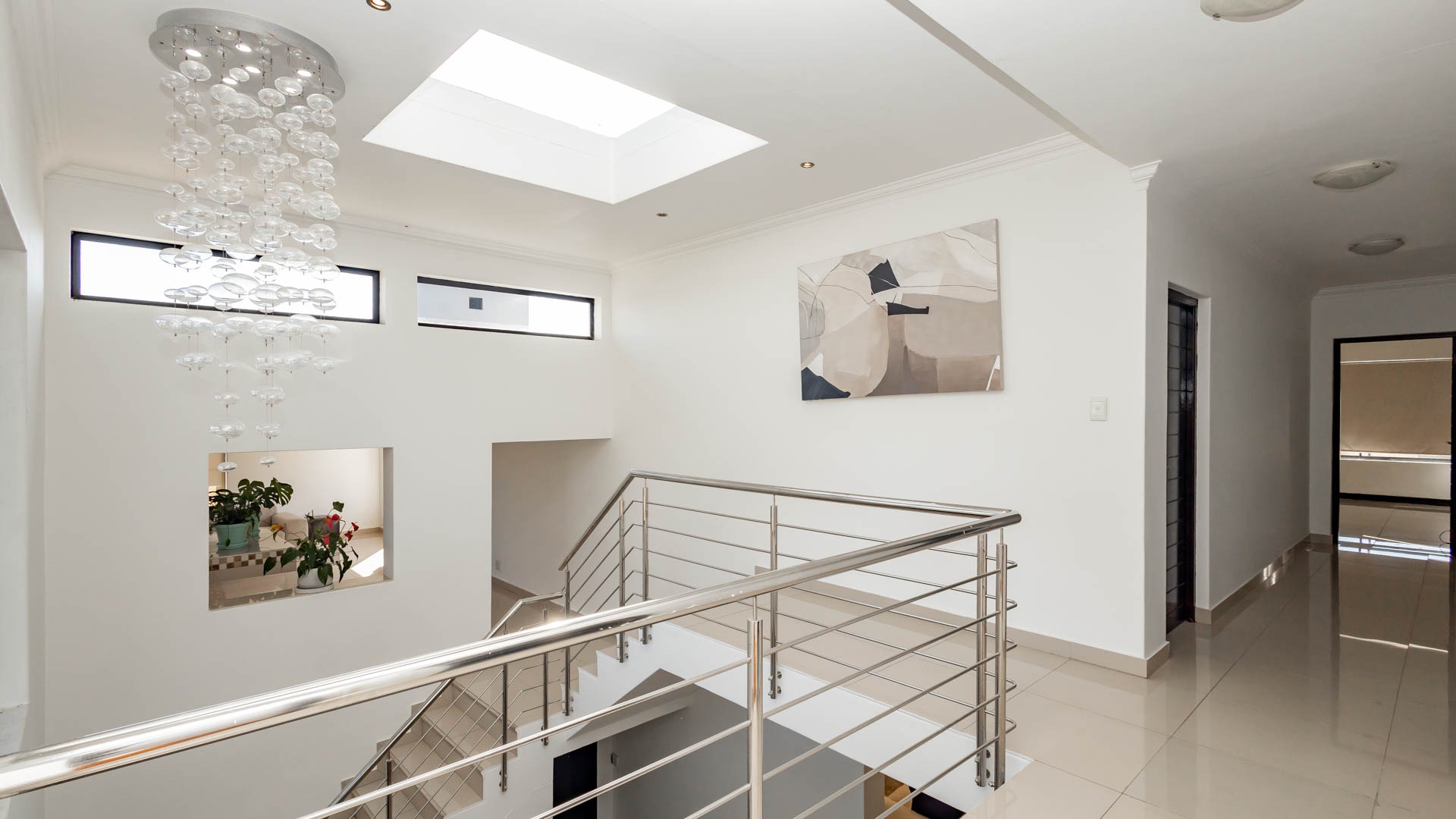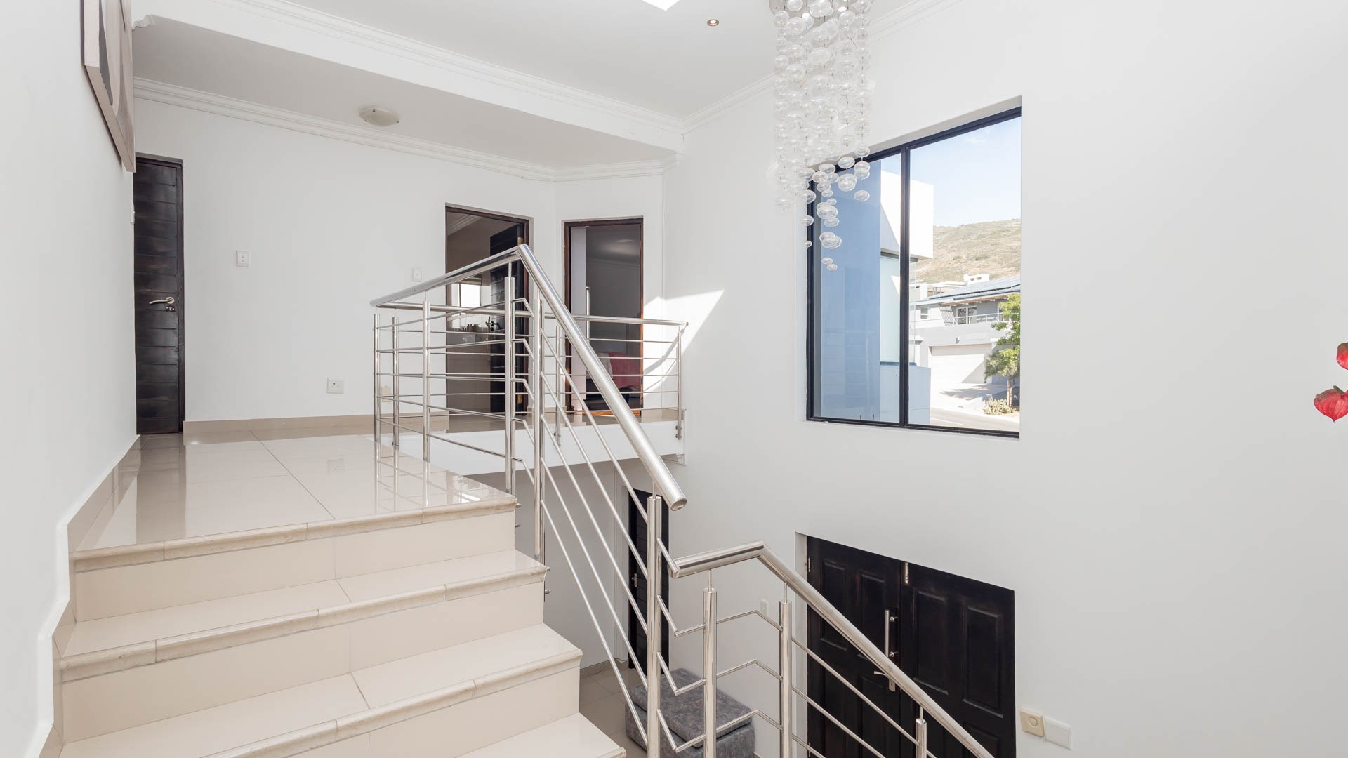Make your way up the elegant staircase framed by a striking chandelier and