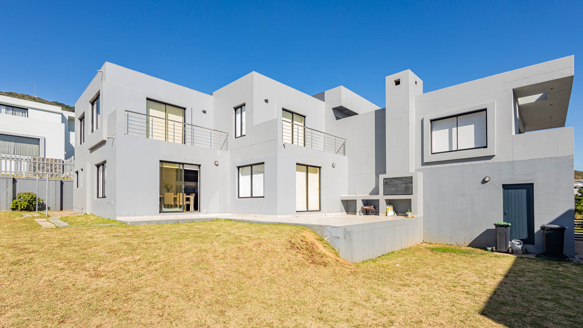 a large backyard and patio space with a built-in braai, ideal for enjoying