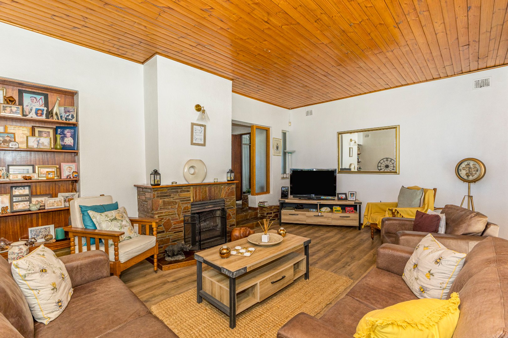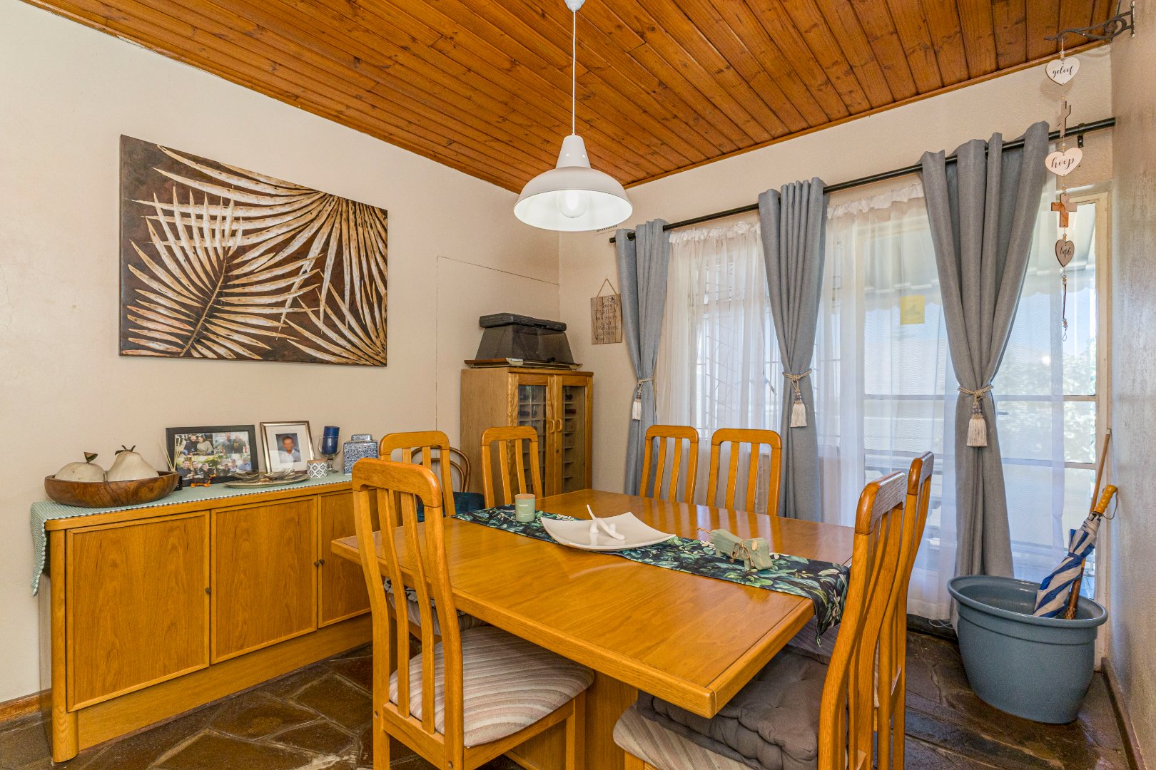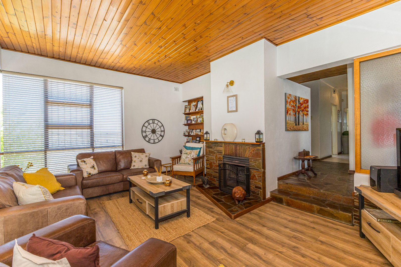 The interior boasts a distinctive living area featuring a warm wooden slatted ceiling, a prominent stone-clad fireplace, and durable wood-look flooring, creating an inviting atmosphere. Large windows ensure ample natural light throughout this space. Adjacent to the main living areas, an enclosed multi-purpose room with unique flagstone flooring and vertical blinds offers additional versatile space, ideal for a utility area or sunroom. The home also includes a dedicated dining room, perfect for family meals and entertaining.