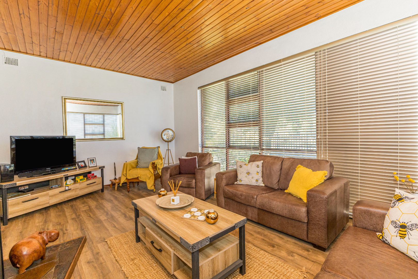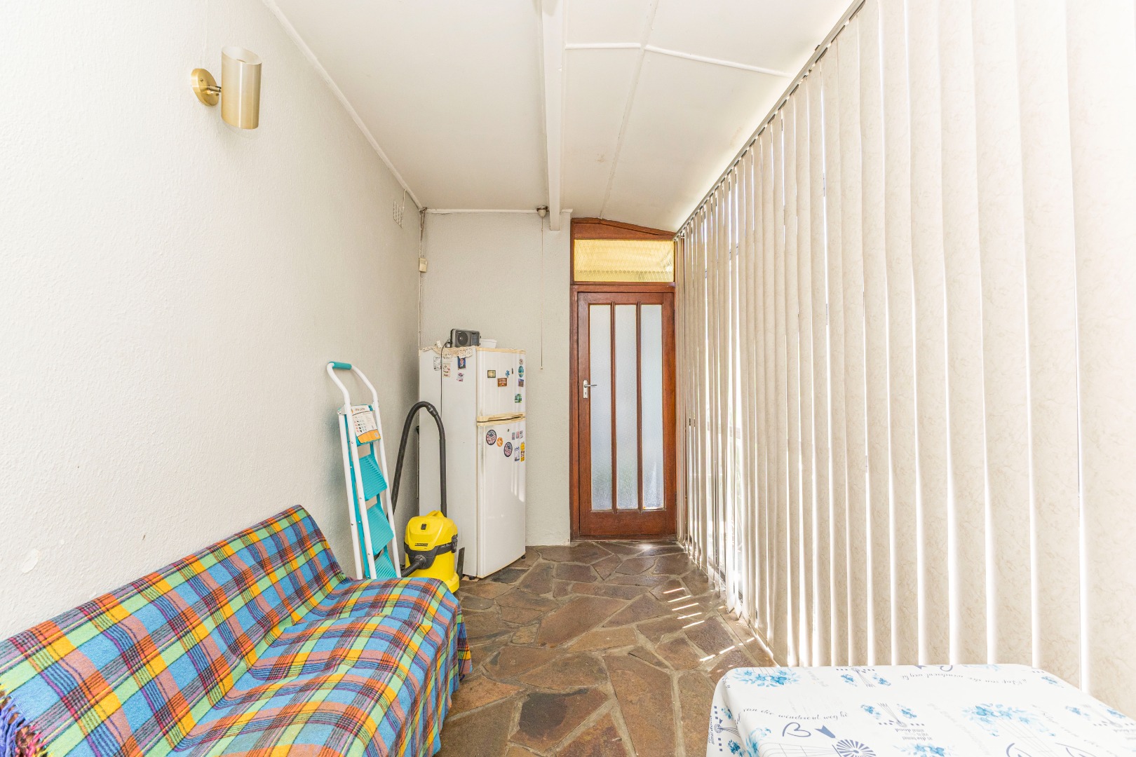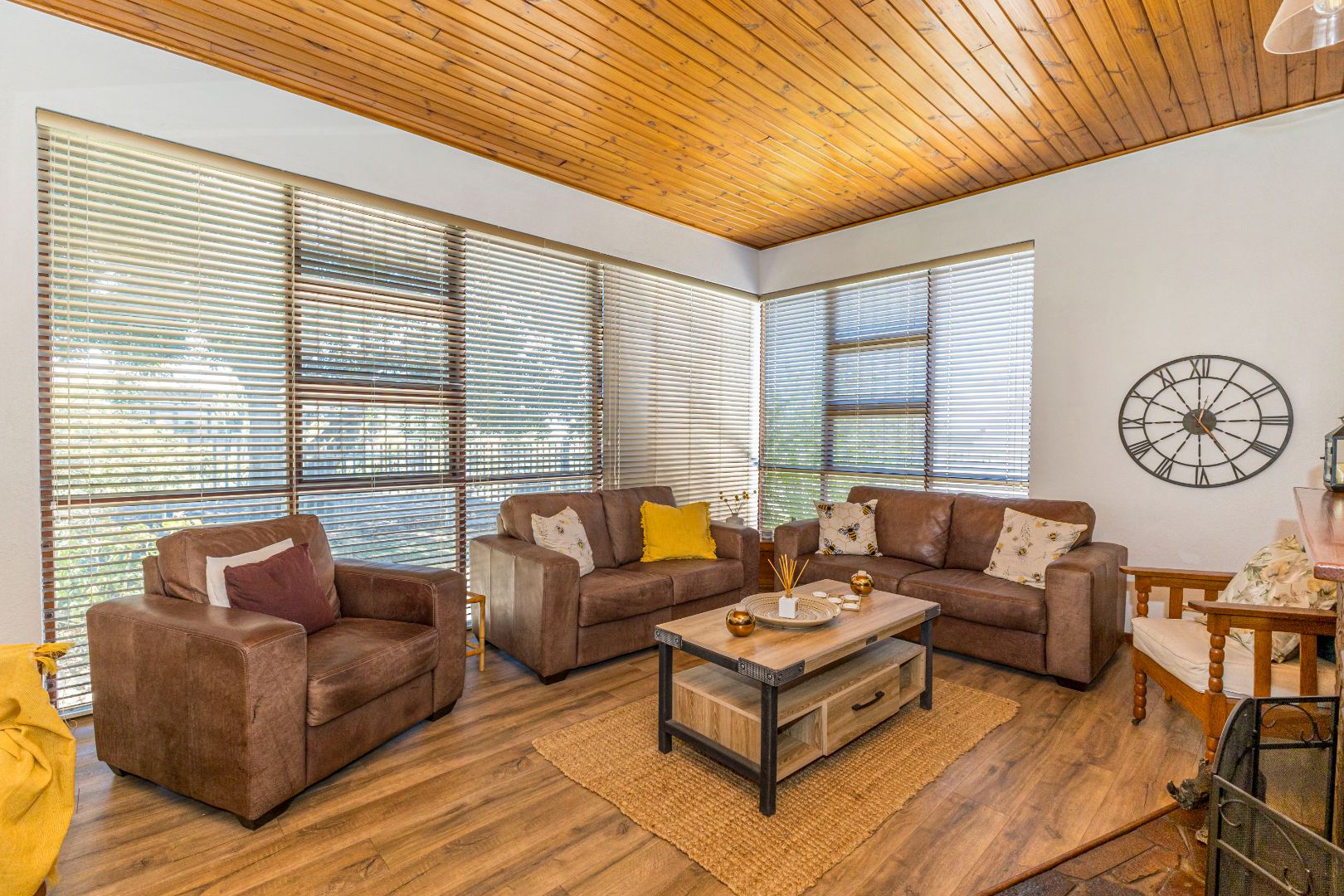 The interior boasts a distinctive living area featuring a warm wooden slatted ceiling, a prominent stone-clad fireplace, and durable wood-look flooring, creating an inviting atmosphere. Large windows ensure ample natural light throughout this space. Adjacent to the main living areas, an enclosed multi-purpose room with unique flagstone flooring and vertical blinds offers additional versatile space, ideal for a utility area or sunroom. The home also includes a dedicated dining room, perfect for family meals and entertaining.