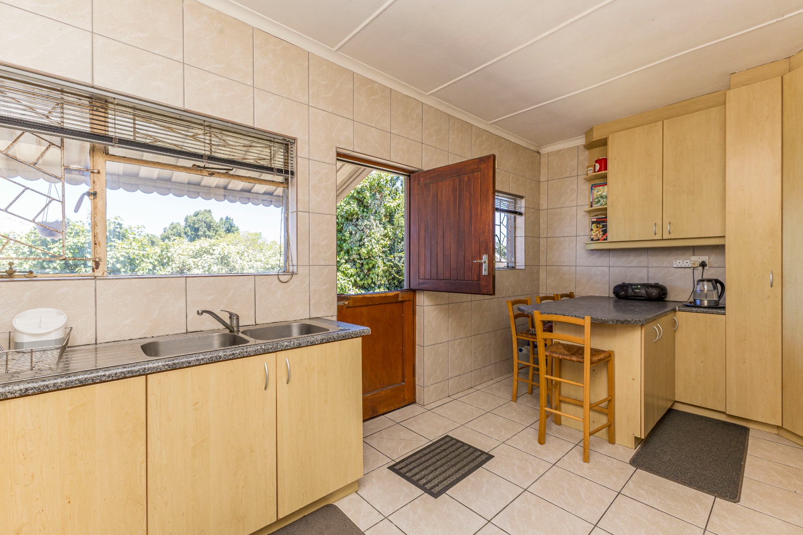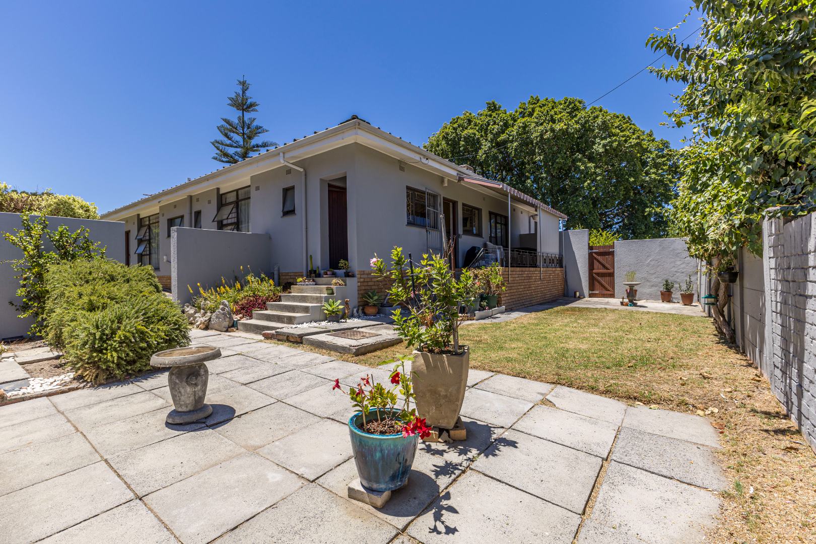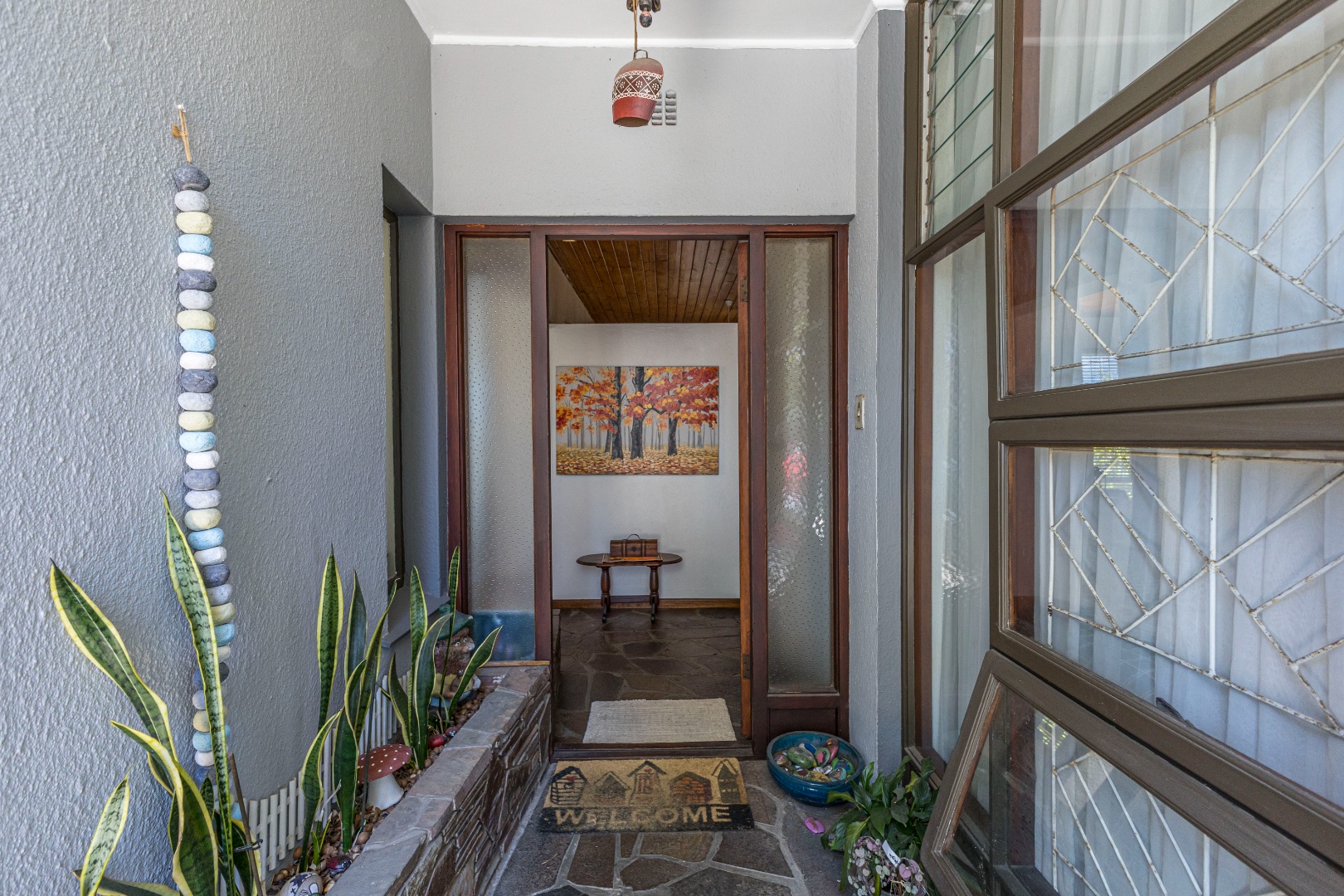 Externally, the property features a double garage and a long tarred driveway, providing generous off-street parking. The front garden, with its mature shade trees and established beds, offers a welcoming entrance, though the lawn may benefit from some attention. The stone-paved porch with a built-in planter adds to the kerb appeal, complemented by security bars on the windows for peace of mind.