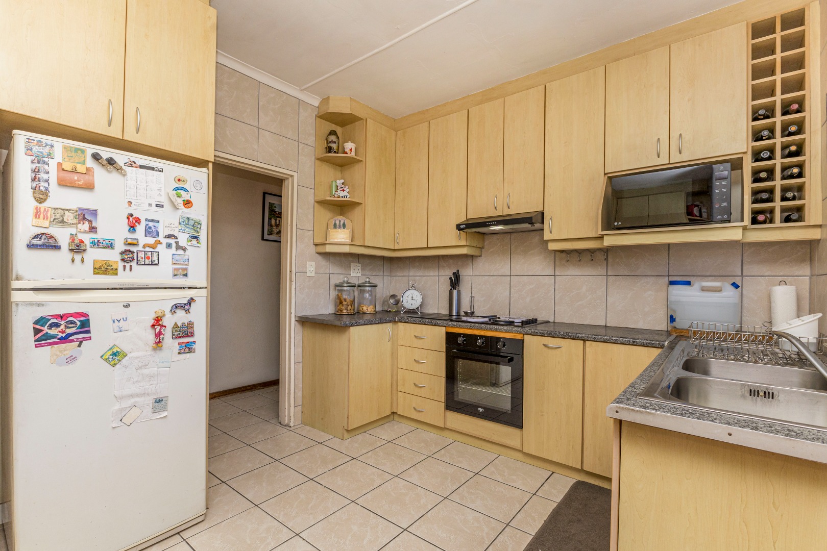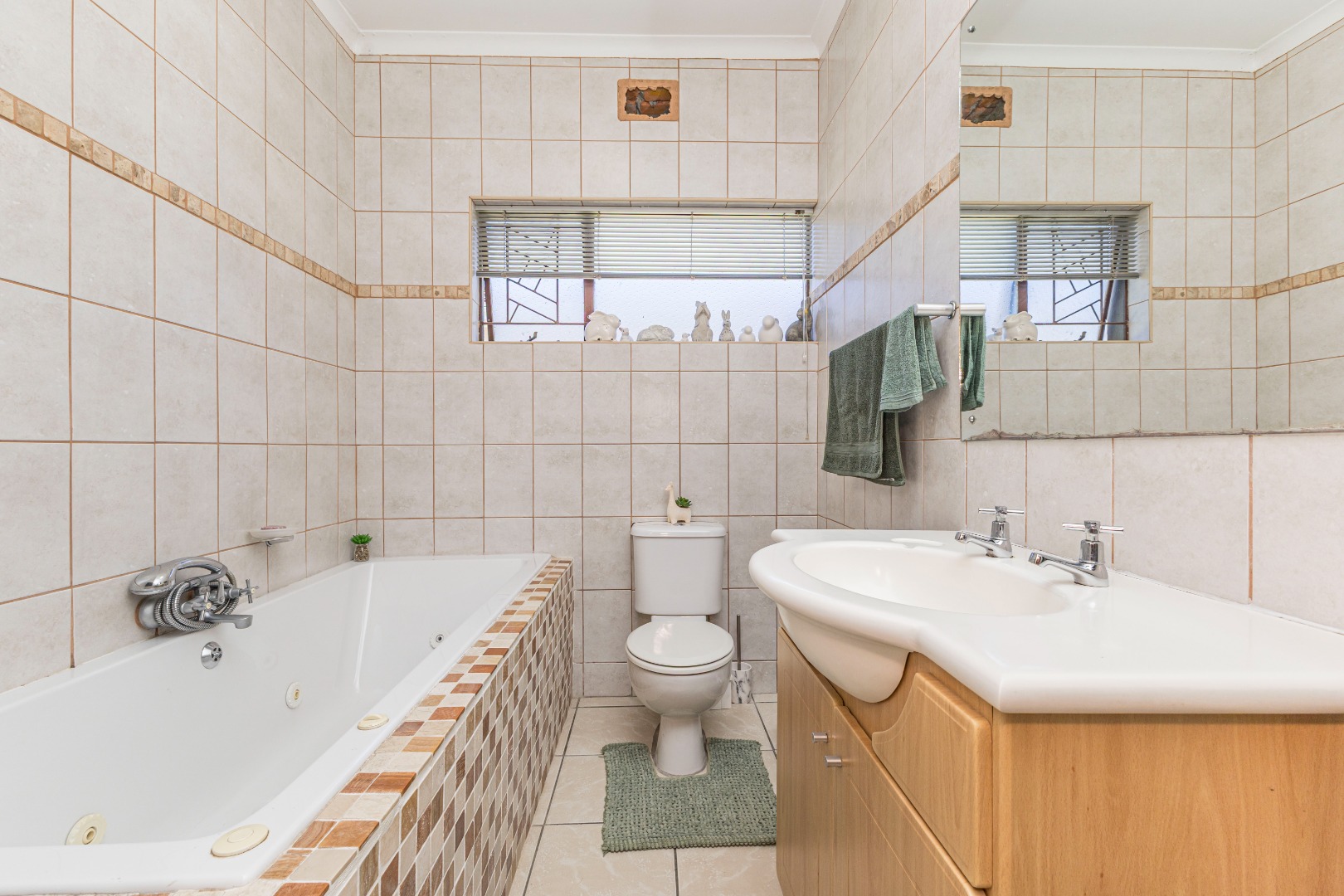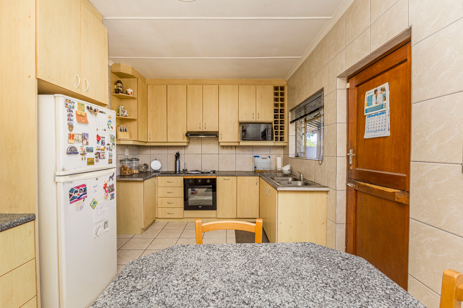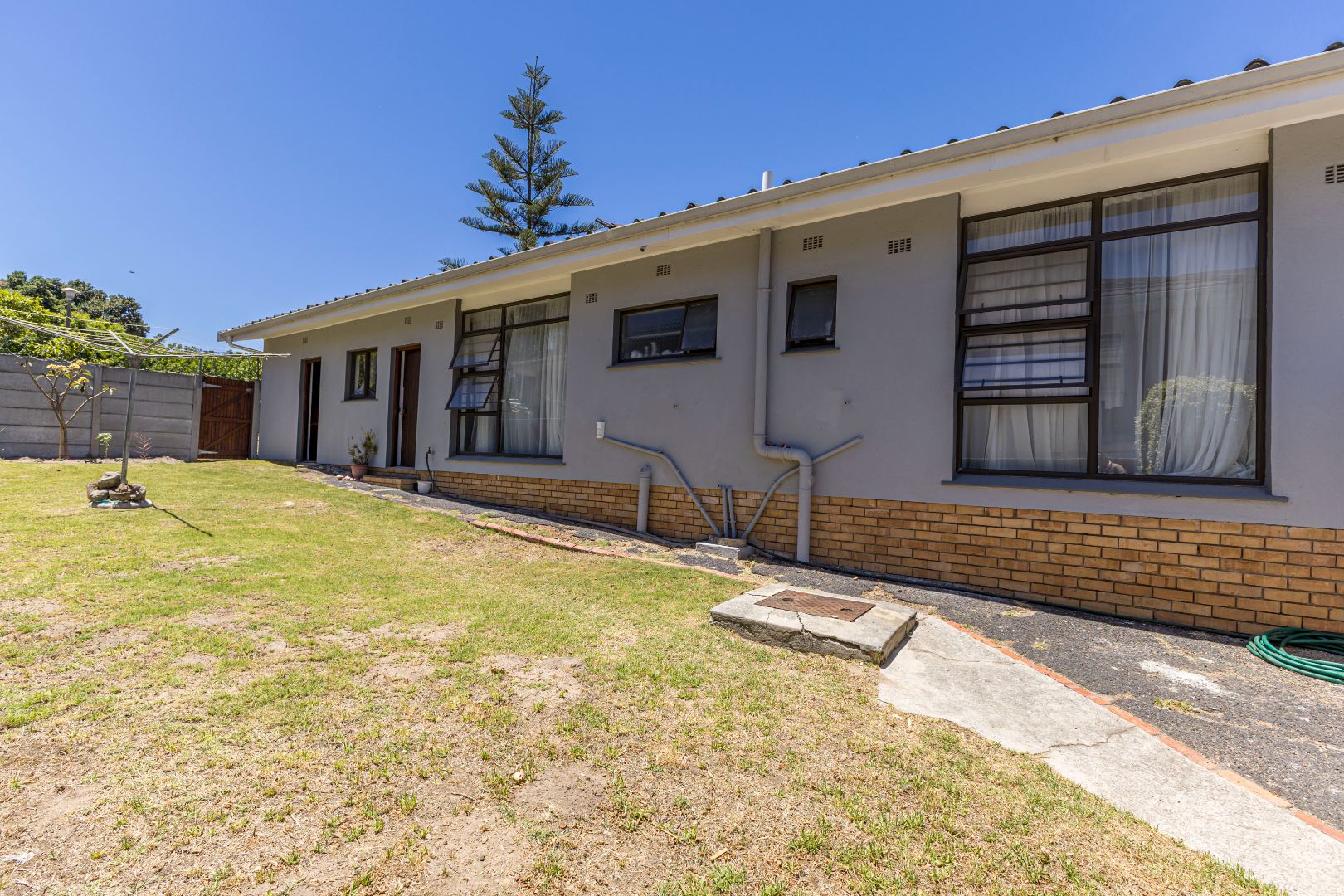 Externally, the property features a double garage and a long tarred driveway, providing generous off-street parking. The front garden, with its mature shade trees and established beds, offers a welcoming entrance, though the lawn may benefit from some attention. The stone-paved porch with a built-in planter adds to the kerb appeal, complemented by security bars on the windows for peace of mind.