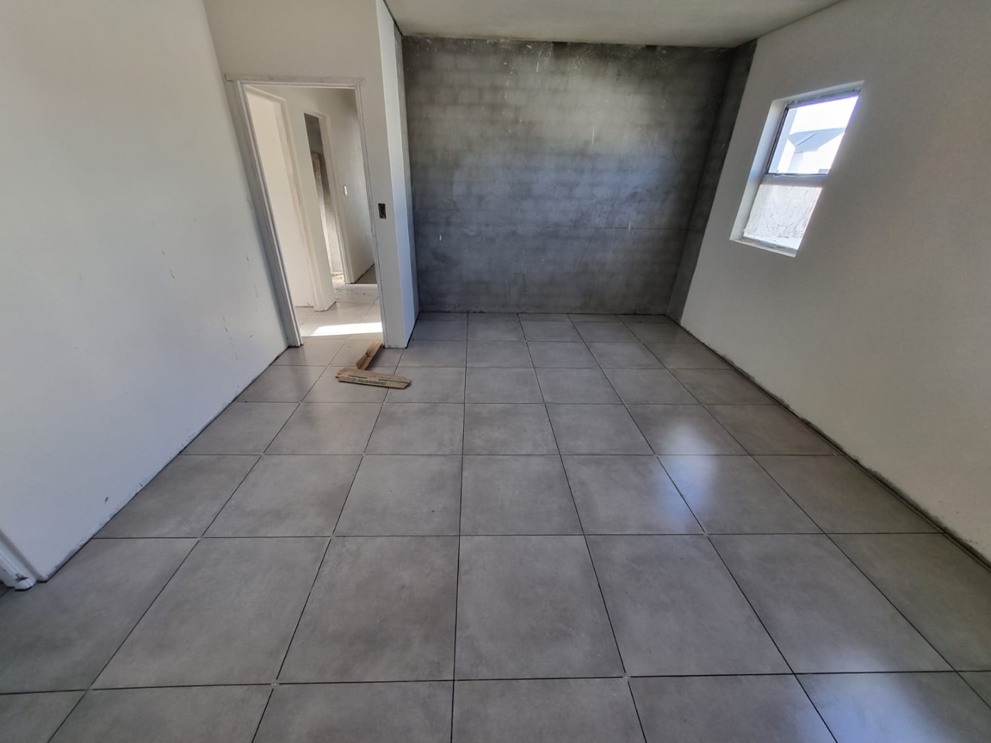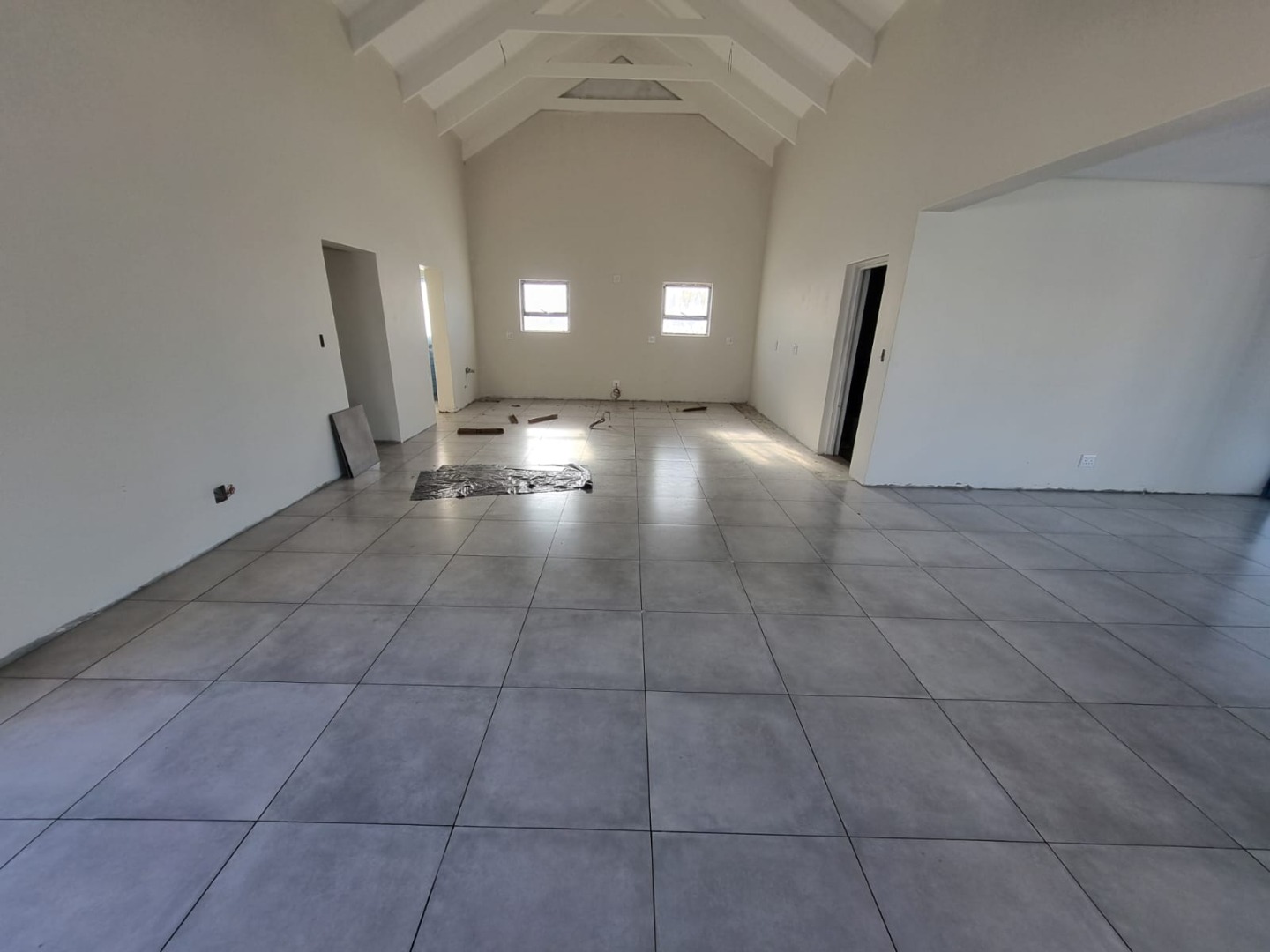 The contemporary kitchen is both functional and striking, finished with premium Caesarstone countertops, a gas hob, and a discreetly positioned scullery offering generous appliance connections. Sustainability meets comfort with the inclusion of a solar geyser and prepaid Eskom electricity for convenience and efficiency.