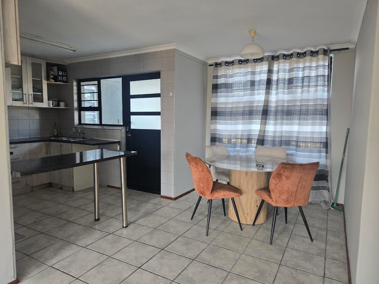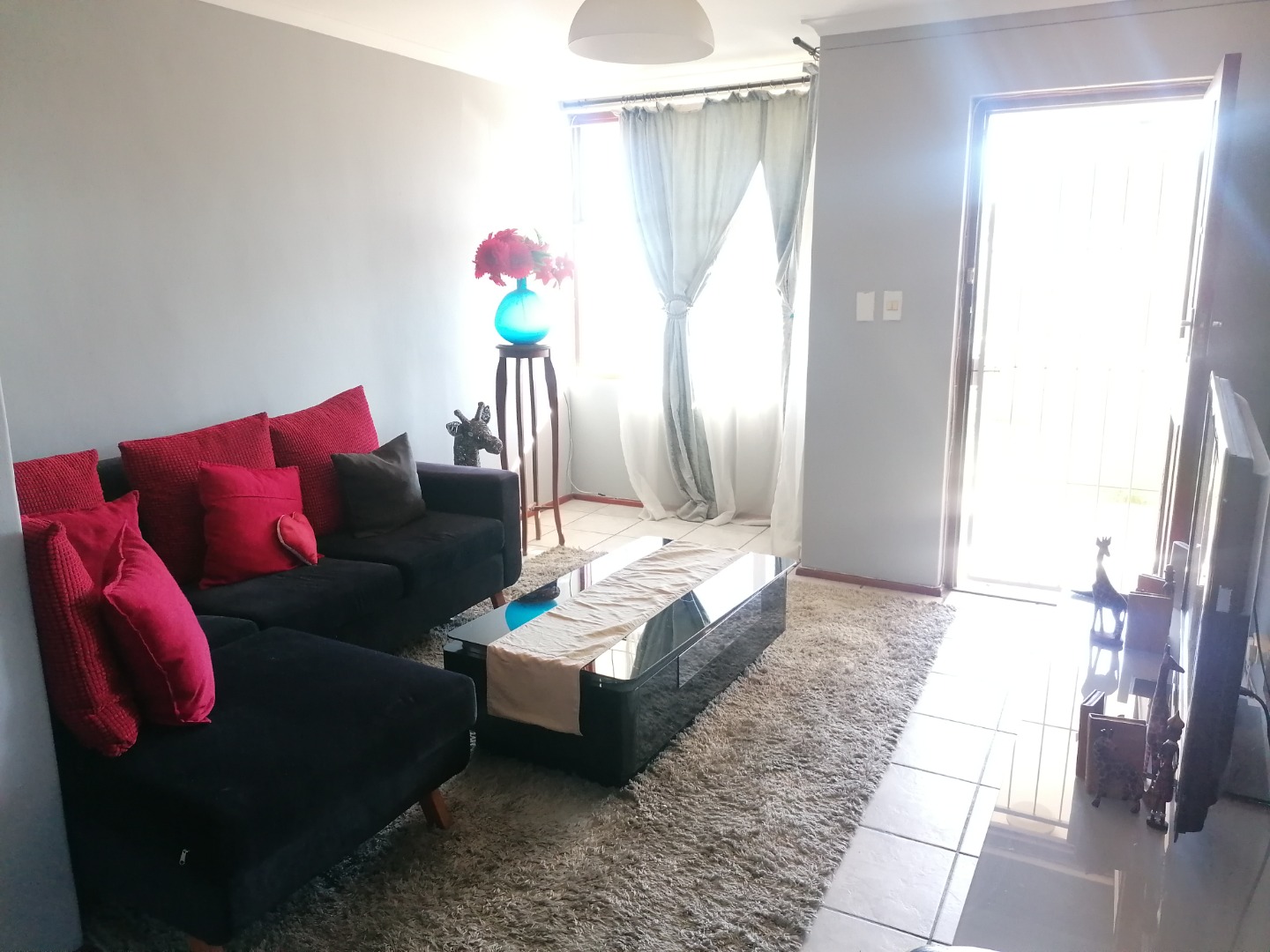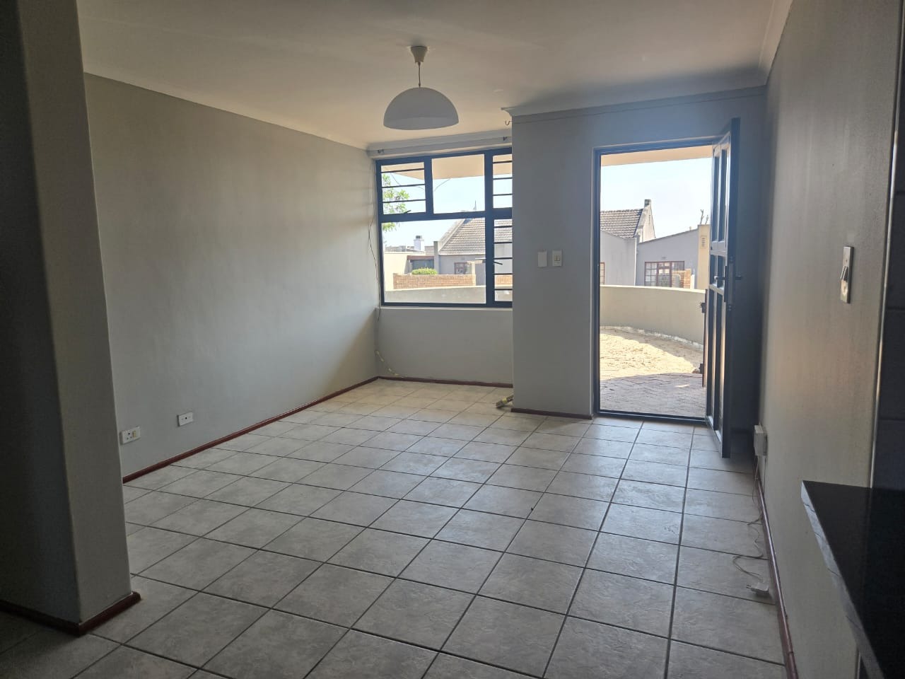 The interior boasts a bright and modern living area, characterized by light grey walls and practical tiled flooring throughout. This open-plan space benefits from ample natural light streaming through large windows and a glass door, creating an airy and welcoming atmosphere. It provides a versatile setting for relaxation and entertaining, seamlessly connecting to the dining area.