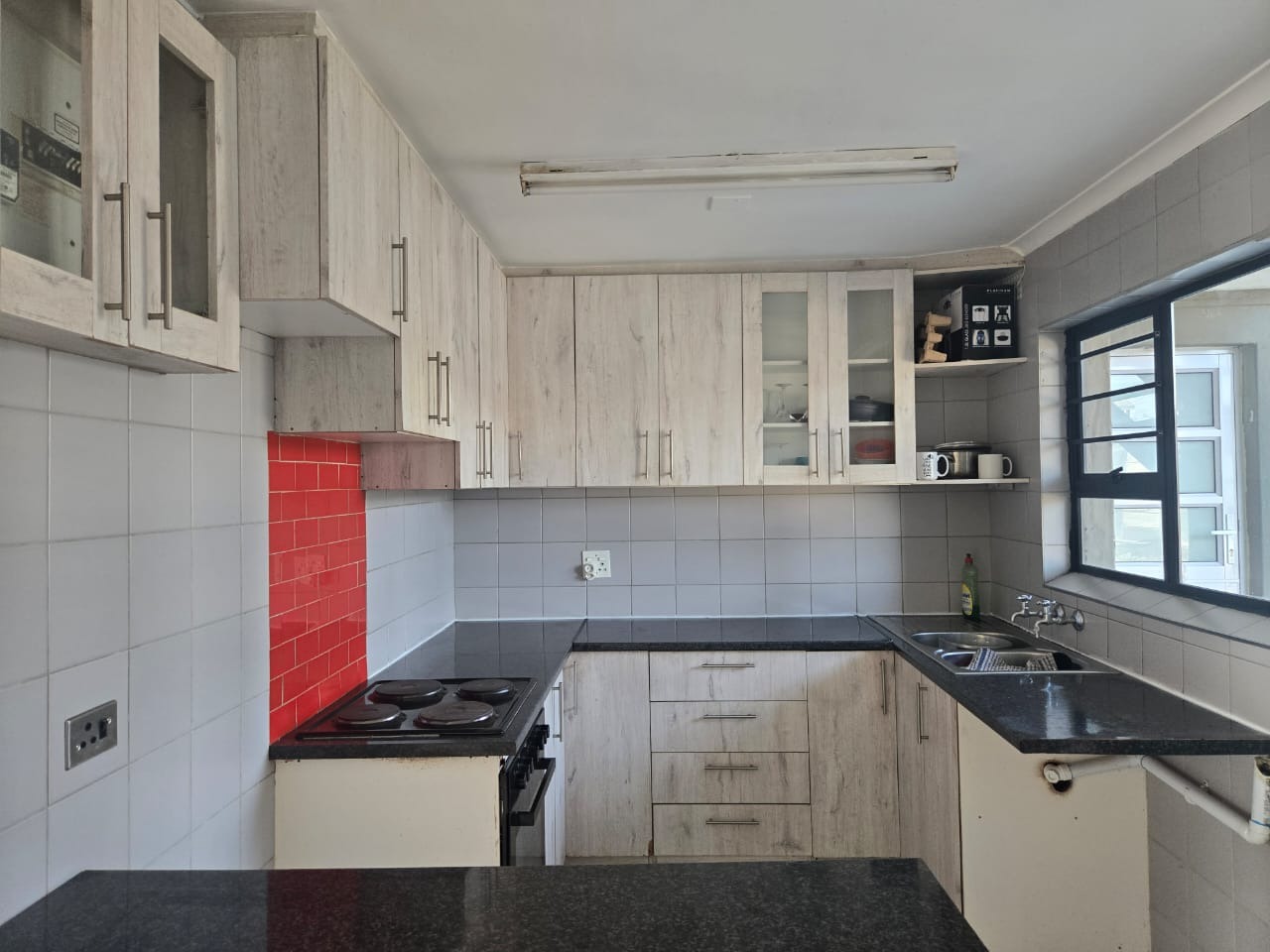 Prepare meals in the functional kitchen, equipped with extensive light wood-grain cabinetry and generous dark granite-look countertops. A practical double sink and tiled walls enhance usability, while a large window ensures natural light. This well-appointed kitchen offers ample storage and workspace for daily needs.