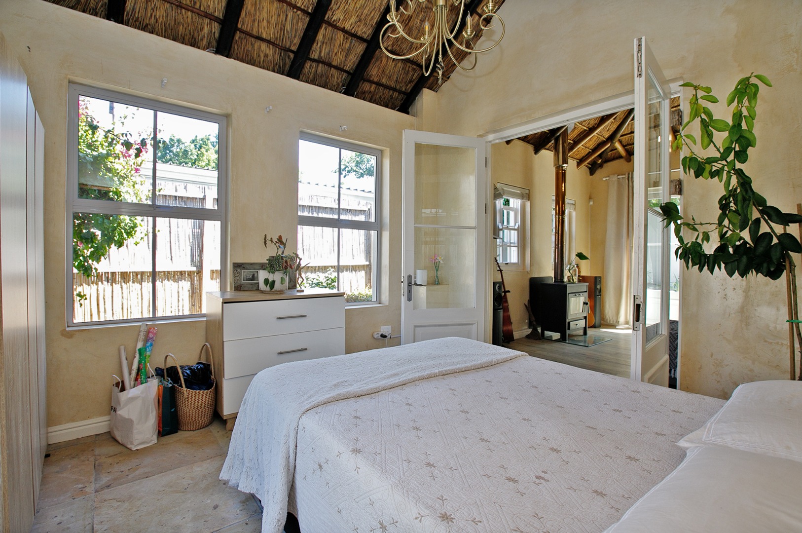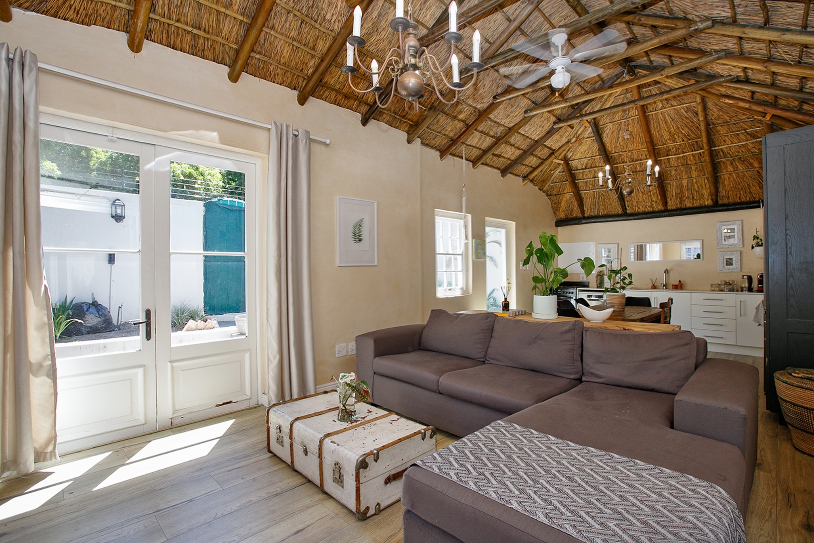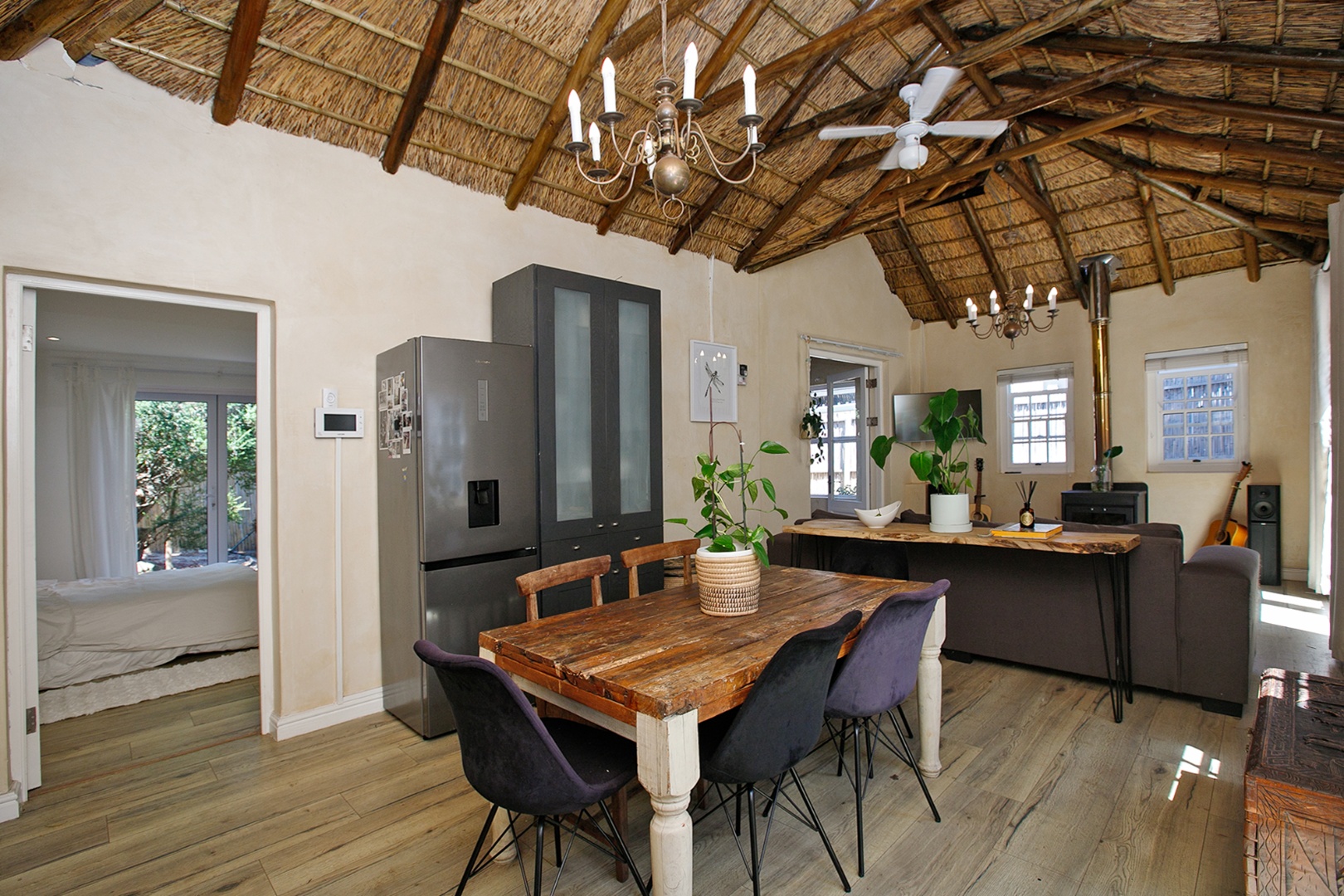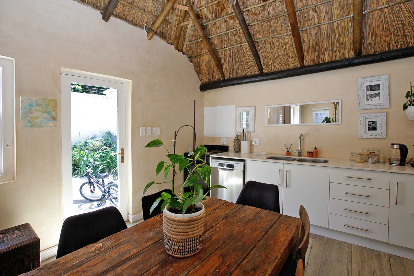 This charming 2-bedroom, 1-bathroom residence in Constantia, Cape Town, offers a unique rental opportunity. Step inside to discover an inviting open-plan living area, distinguished by its striking vaulted thatched ceiling and exposed wooden beams, creating a warm and rustic ambiance. The space is bathed in natural light, enhanced by multiple windows and large sliding glass doors that seamlessly connect the interior to the private outdoor areas. A cozy wood-burning stove provides warmth and character, complementing the comfortable lounge space. The modern kitchen is integrated into this open layout, featuring essential appliances and ample counter space, perfect for daily living and entertaining. Wooden flooring flows throughout, adding to the home's cohesive and natural aesthetic.