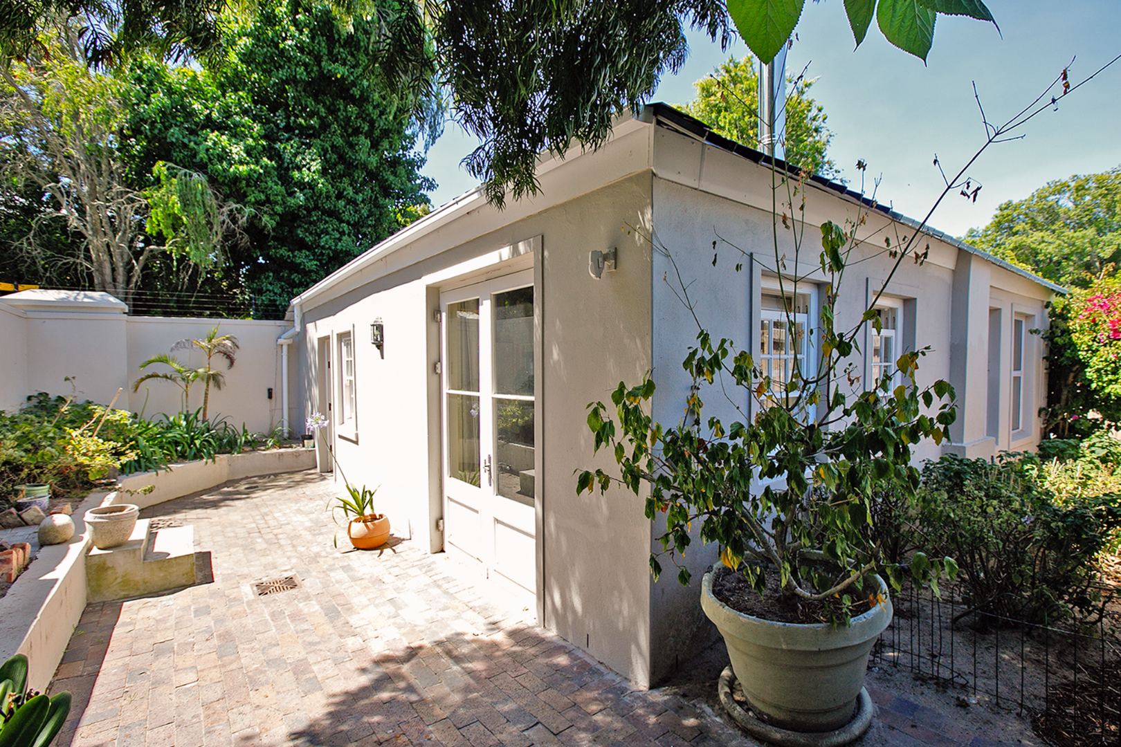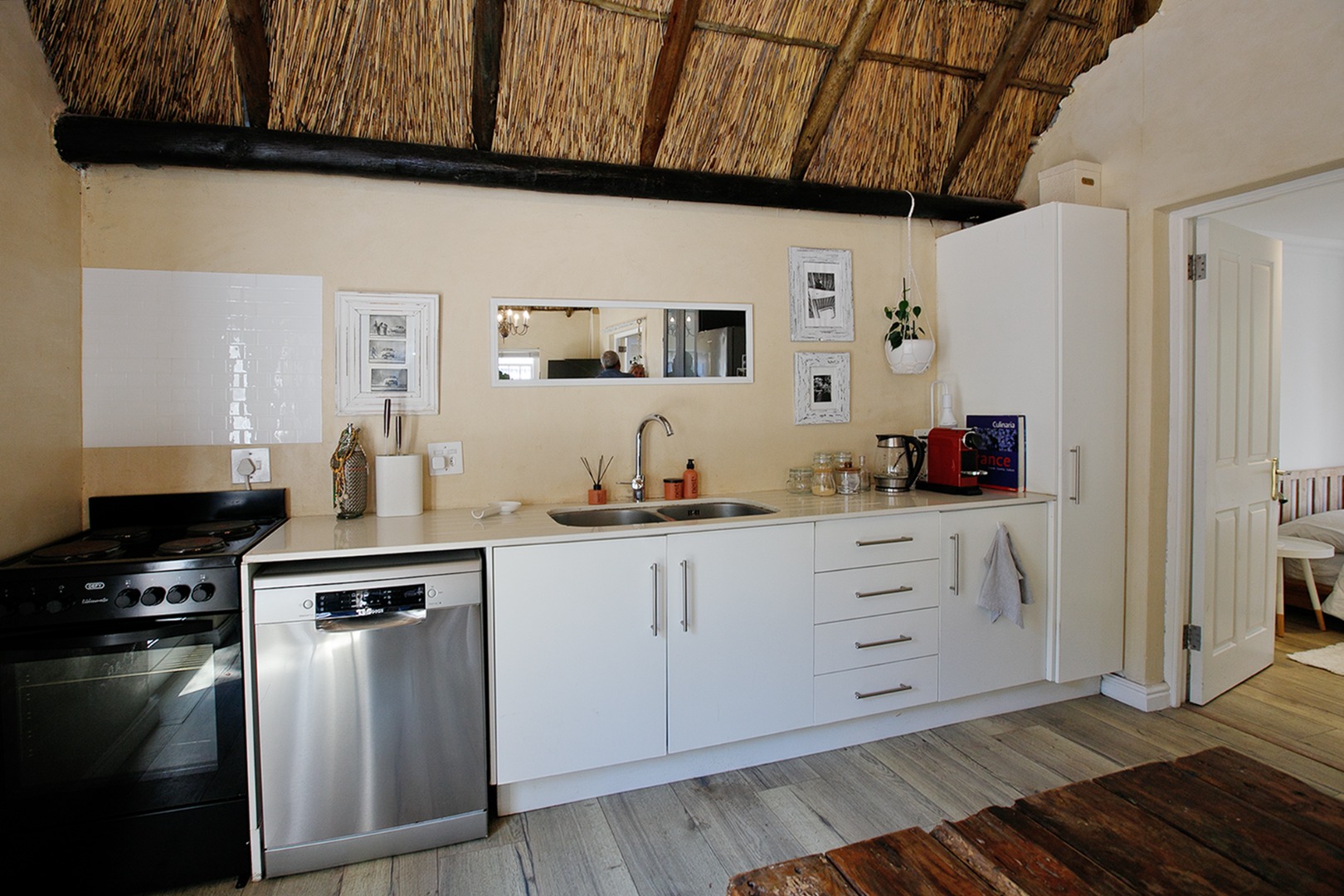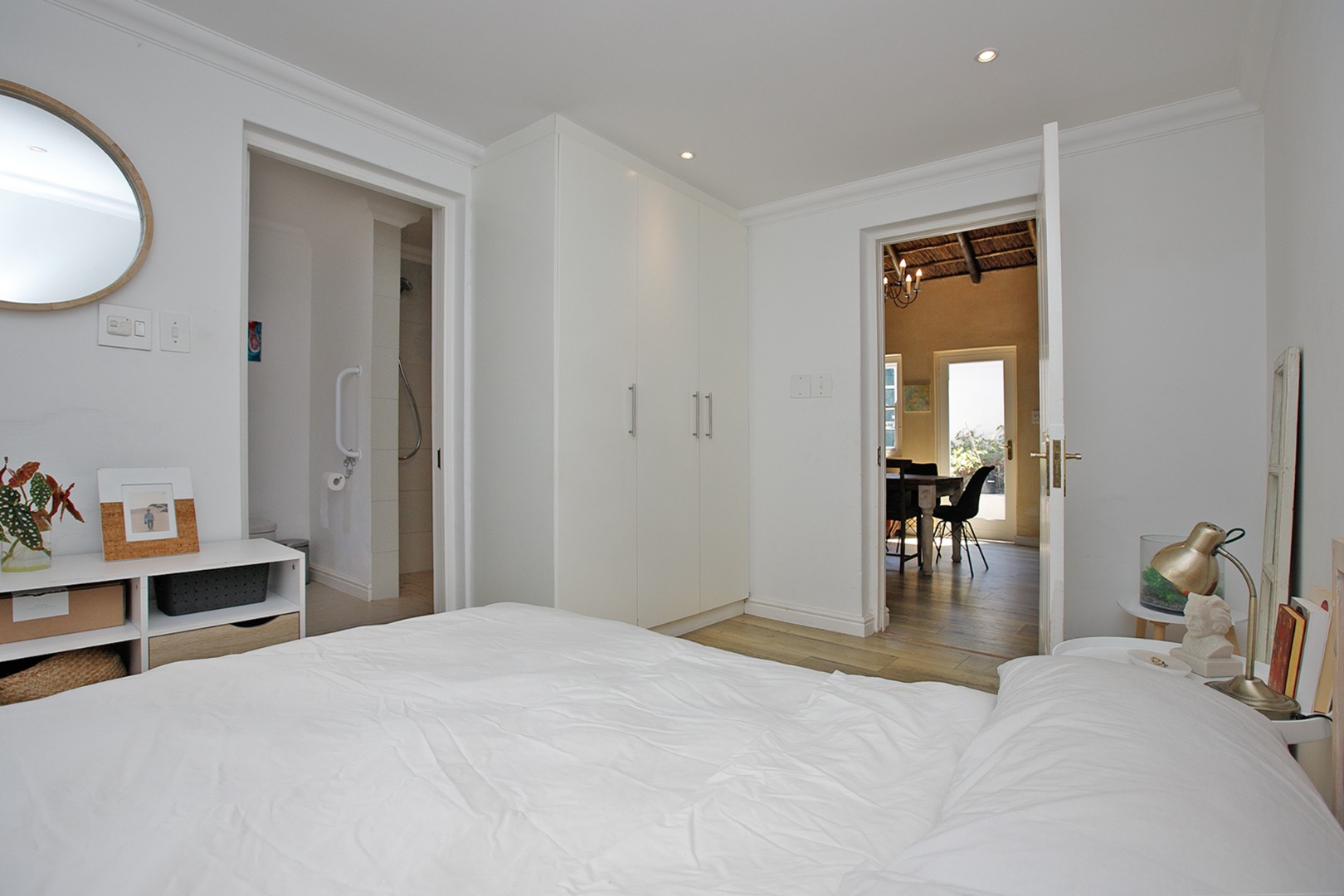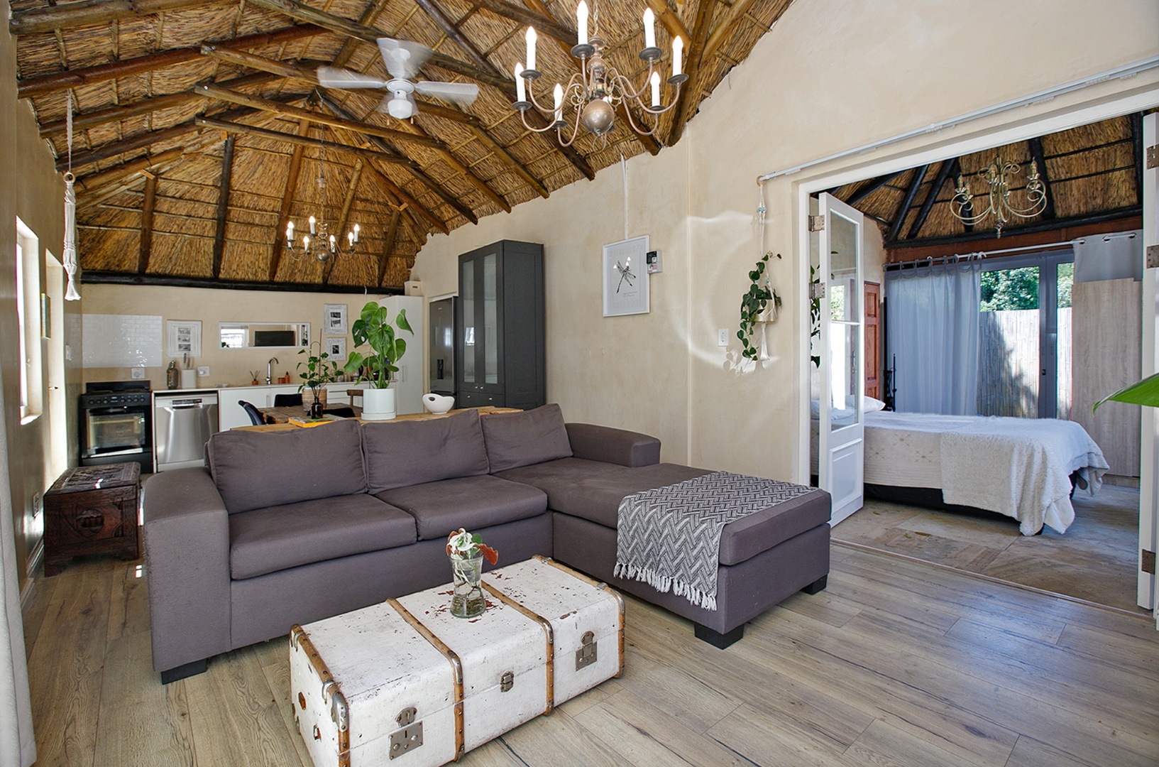 This charming 2-bedroom, 1-bathroom residence in Constantia, Cape Town, offers a unique rental opportunity. Step inside to discover an inviting open-plan living area, distinguished by its striking vaulted thatched ceiling and exposed wooden beams, creating a warm and rustic ambiance. The space is bathed in natural light, enhanced by multiple windows and large sliding glass doors that seamlessly connect the interior to the private outdoor areas. A cozy wood-burning stove provides warmth and character, complementing the comfortable lounge space. The modern kitchen is integrated into this open layout, featuring essential appliances and ample counter space, perfect for daily living and entertaining. Wooden flooring flows throughout, adding to the home's cohesive and natural aesthetic.