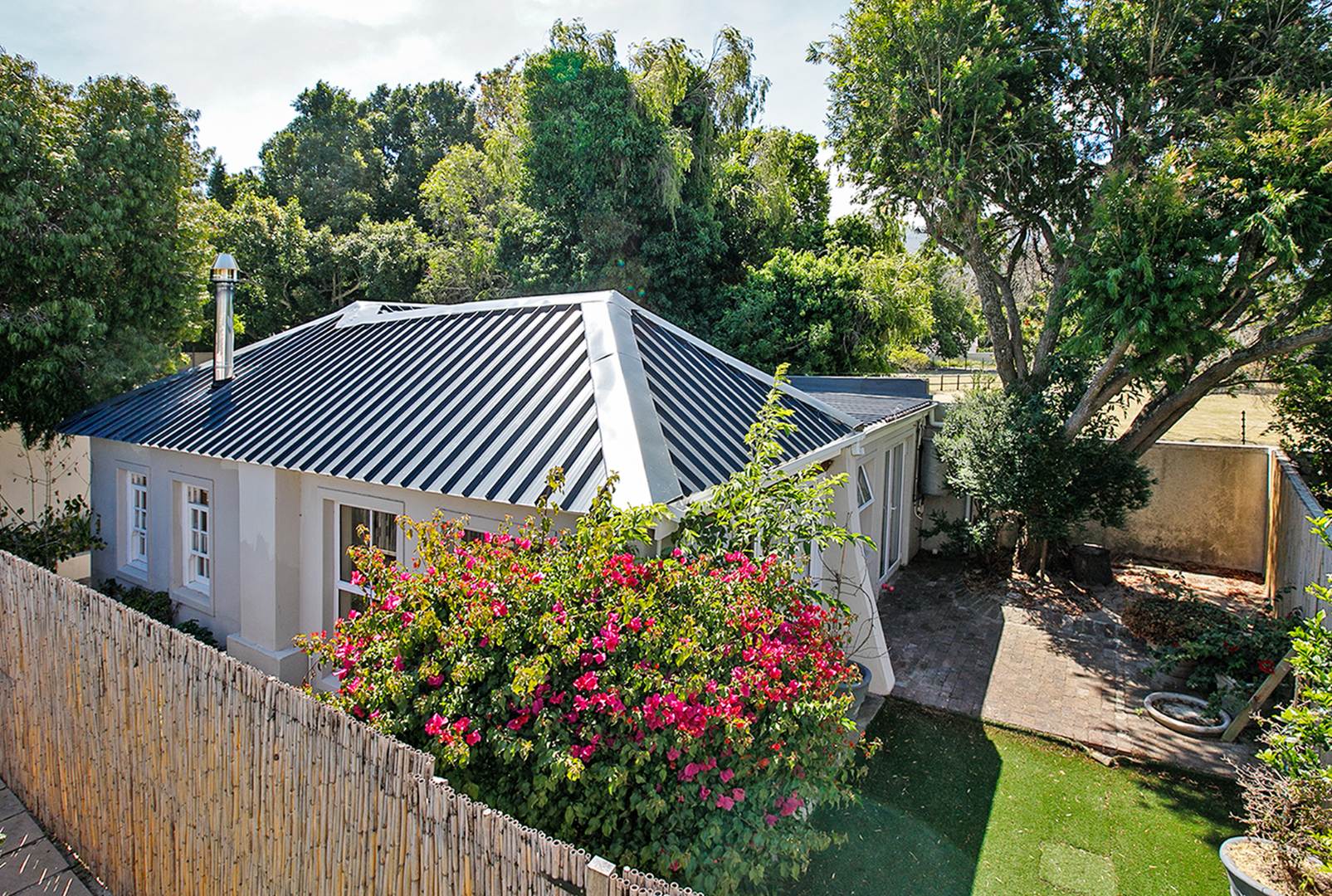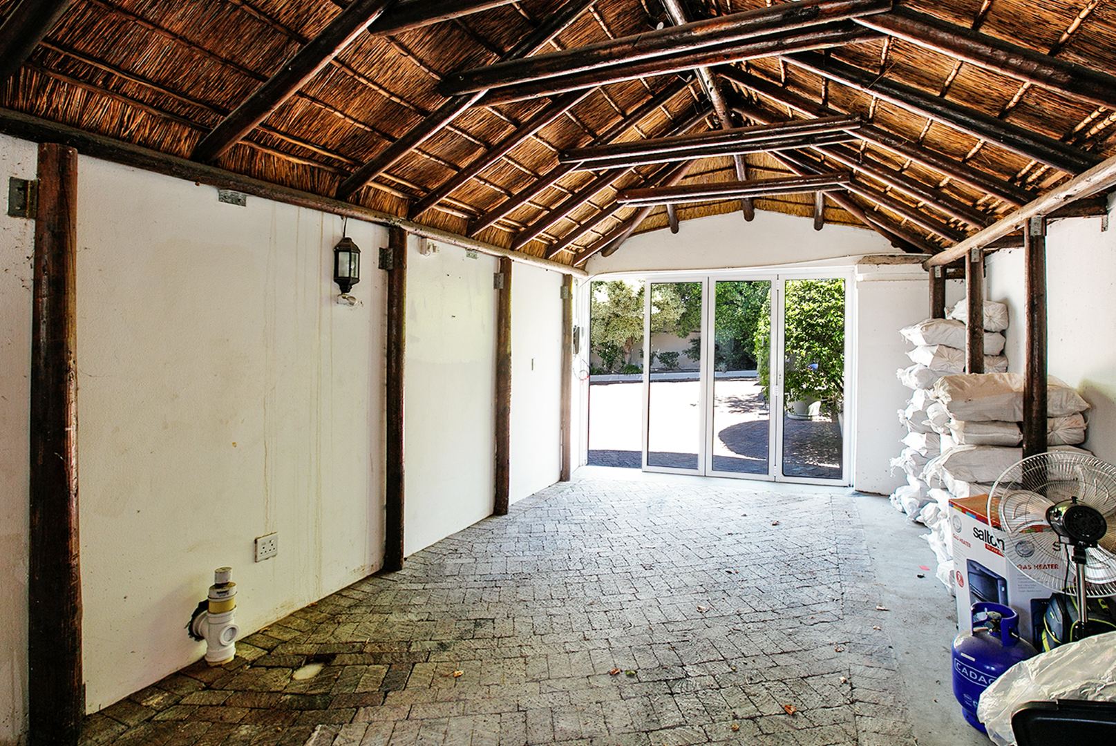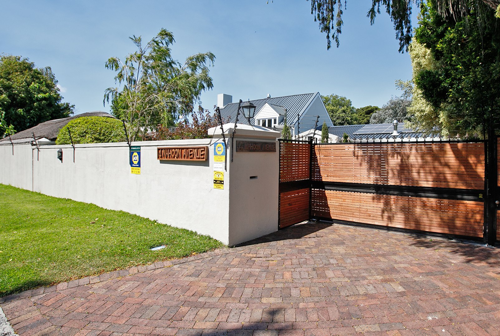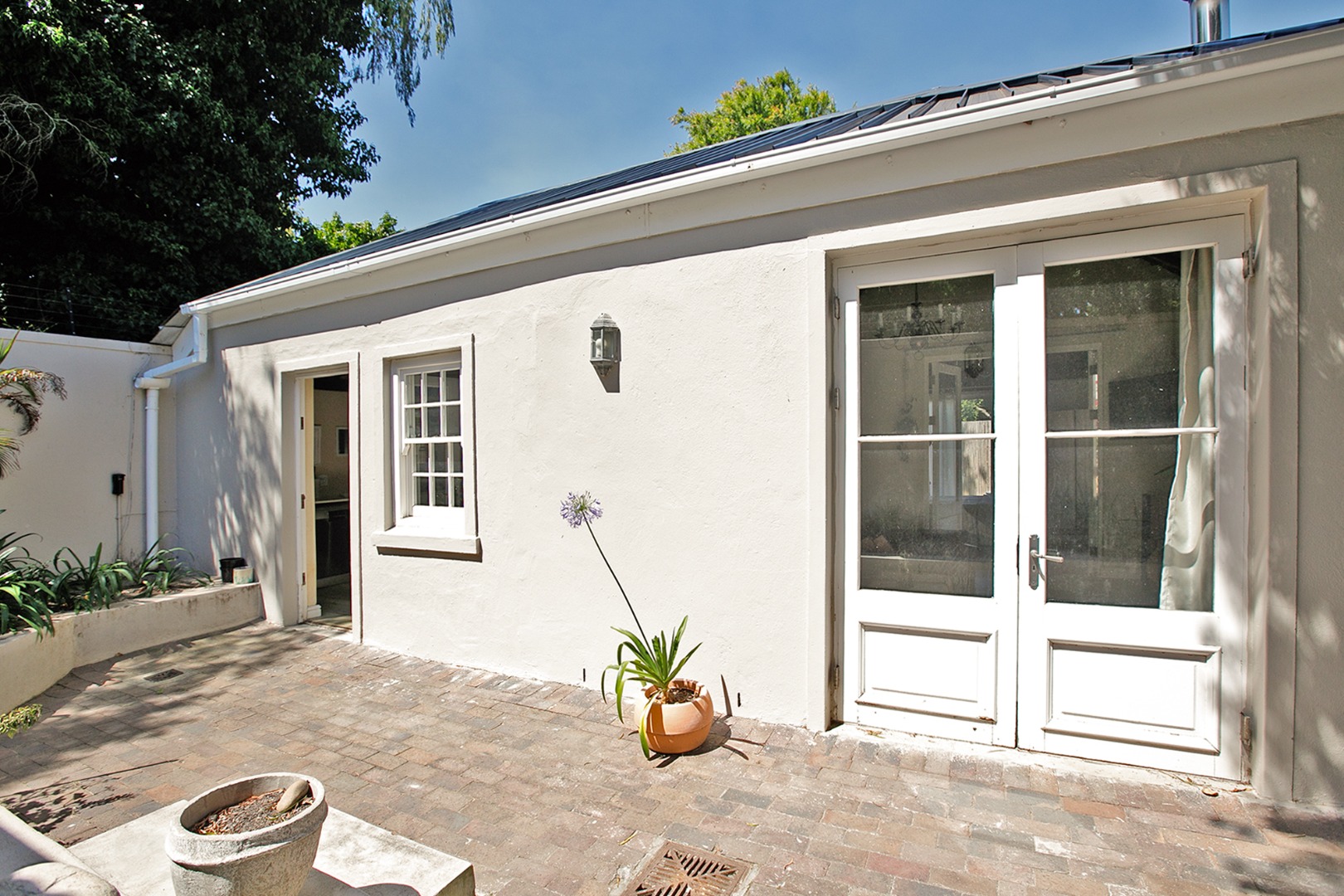 This charming 2-bedroom, 1-bathroom residence in Constantia, Cape Town, offers a unique rental opportunity. Step inside to discover an inviting open-plan living area, distinguished by its striking vaulted thatched ceiling and exposed wooden beams, creating a warm and rustic ambiance. The space is bathed in natural light, enhanced by multiple windows and large sliding glass doors that seamlessly connect the interior to the private outdoor areas. A cozy wood-burning stove provides warmth and character, complementing the comfortable lounge space. The modern kitchen is integrated into this open layout, featuring essential appliances and ample counter space, perfect for daily living and entertaining. Wooden flooring flows throughout, adding to the home's cohesive and natural aesthetic.