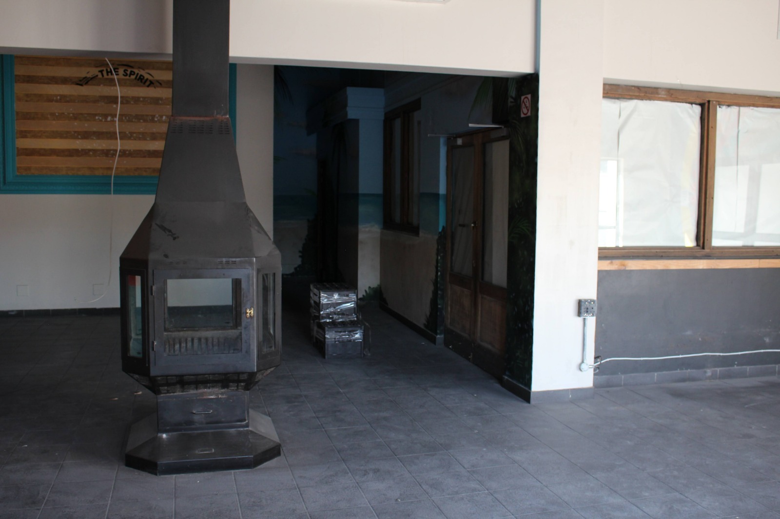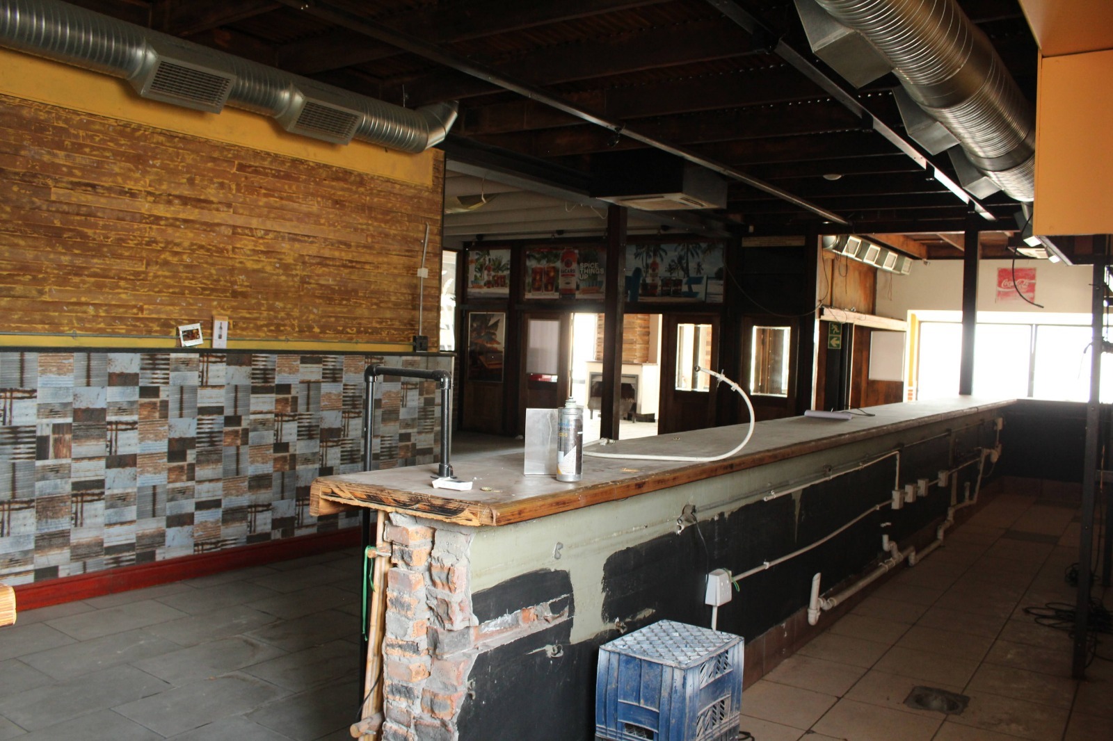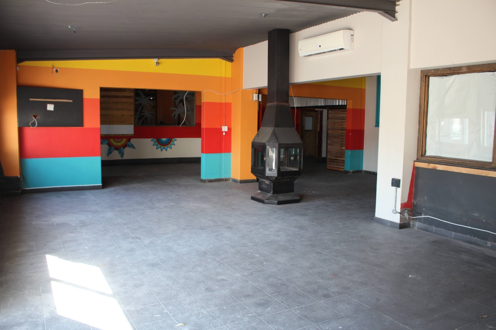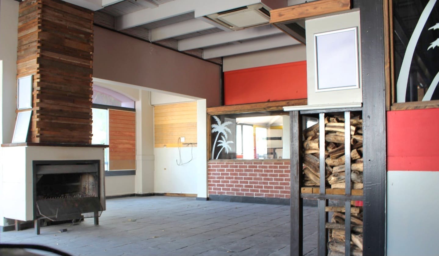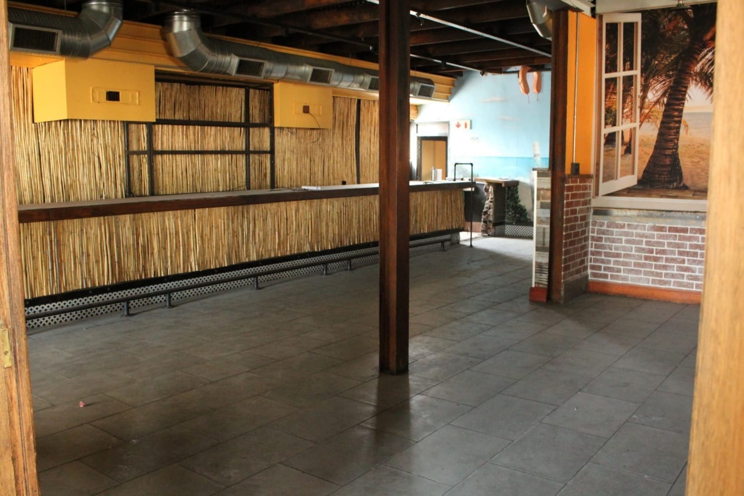 The interior presents a unique canvas, currently showcasing a vibrant, industrial-chic aesthetic with elements like a bar-style counter, a distinctive central industrial-style fireplace, and exposed ductwork. While the space requires a comprehensive fit-out and renovation to align with your specific vision, its adaptable nature makes it ideal for a restaurant, bar, convetion center, or a dynamic office environment. The existing air conditioning unit provides climate control, adding to the comfort of the space.