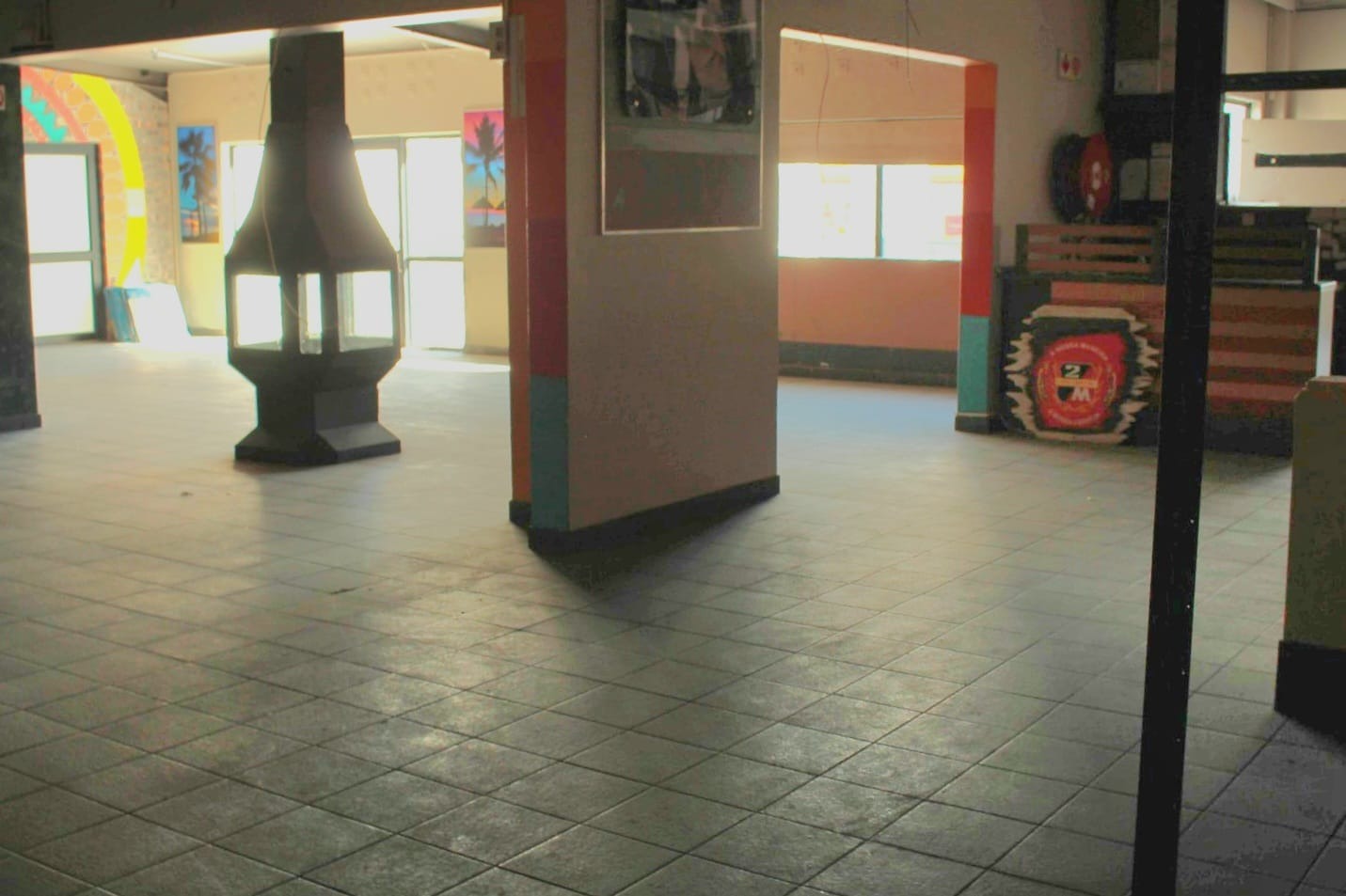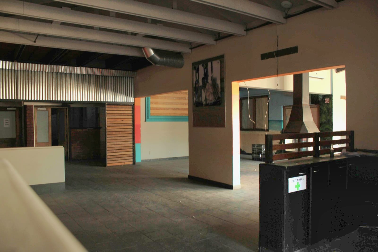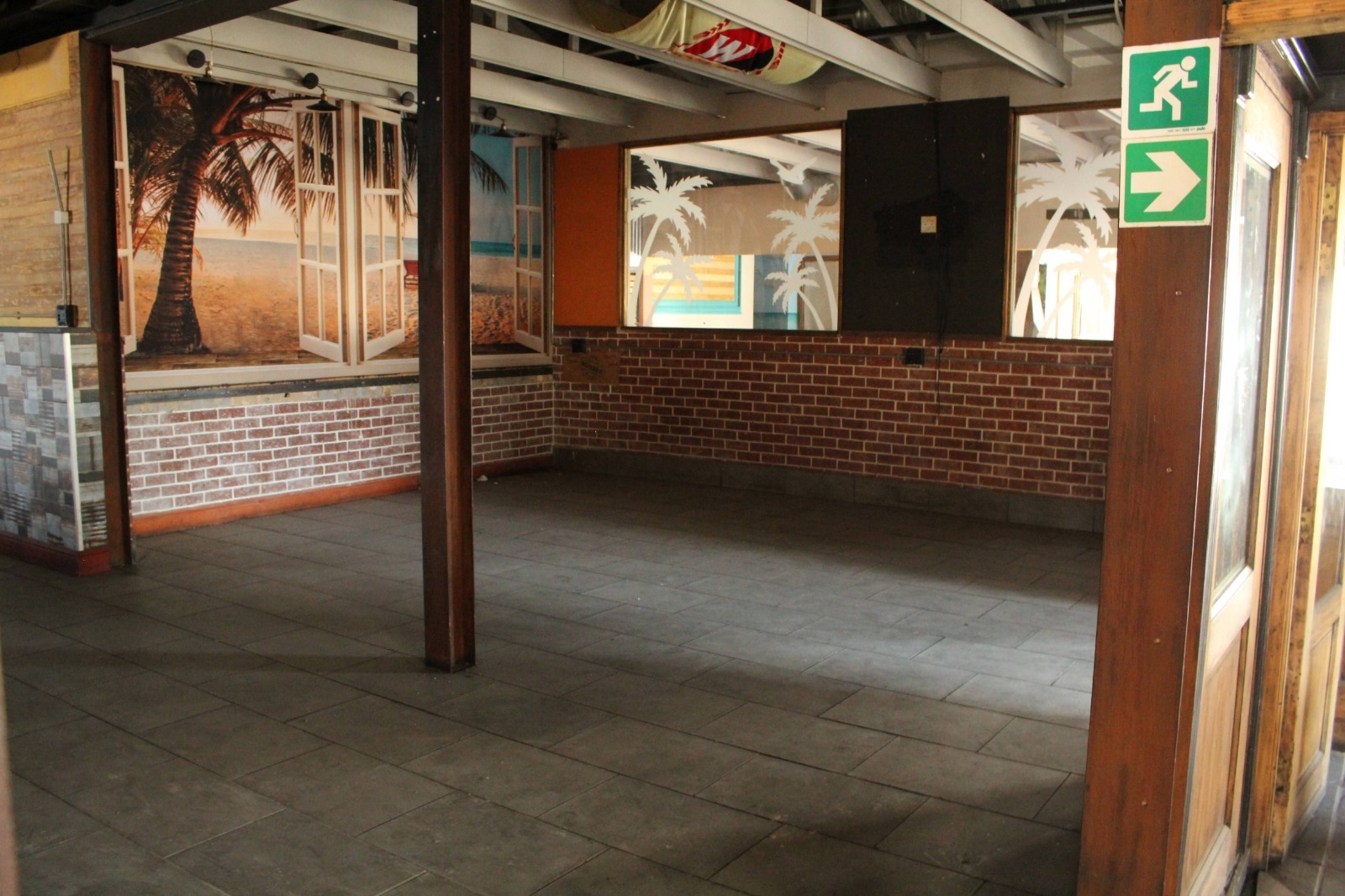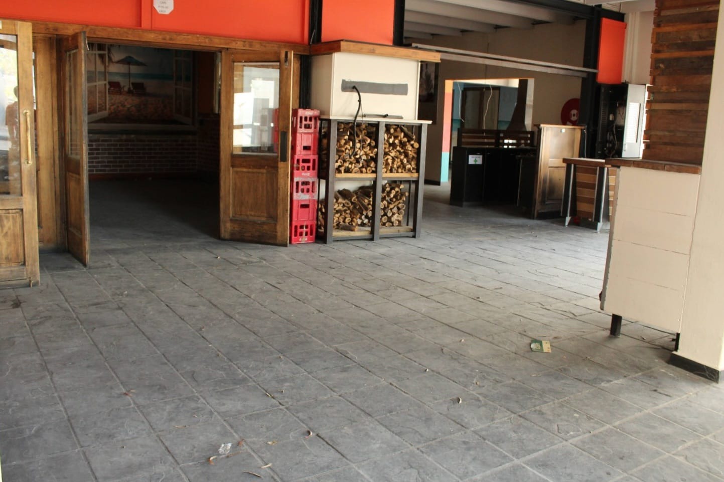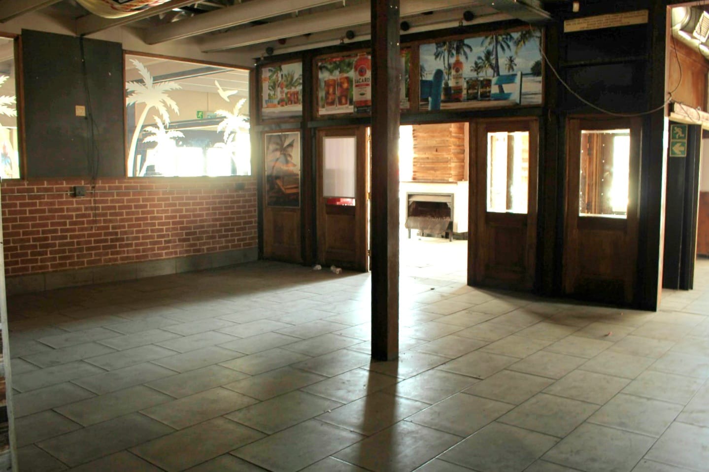 The interior presents a unique canvas, currently showcasing a vibrant, industrial-chic aesthetic with elements like a bar-style counter, a distinctive central industrial-style fireplace, and exposed ductwork. While the space requires a comprehensive fit-out and renovation to align with your specific vision, its adaptable nature makes it ideal for a restaurant, bar, convetion center, or a dynamic office environment. The existing air conditioning unit provides climate control, adding to the comfort of the space.