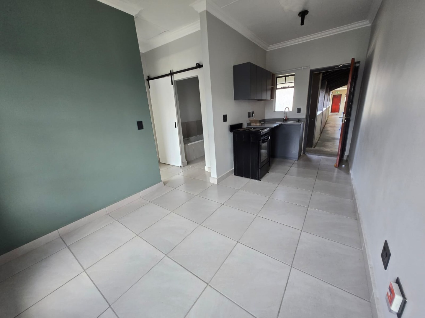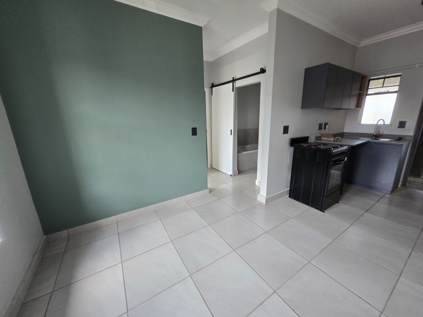 The interior boasts a fresh, clean aesthetic with light-coloured tiled flooring throughout and freshly painted walls, including a tasteful sage green accent wall that adds character. The open-plan layout seamlessly connects the living spaces. The modern kitchen is a highlight, featuring sleek grey cabinetry, a light grey countertop, a single-basin sink, and a freestanding electric stove/oven. Natural light streams in through the kitchen window, creating a bright and inviting atmosphere. A stylish barn-style sliding door leads to the well-appointed bathroom, enhancing the modern design.