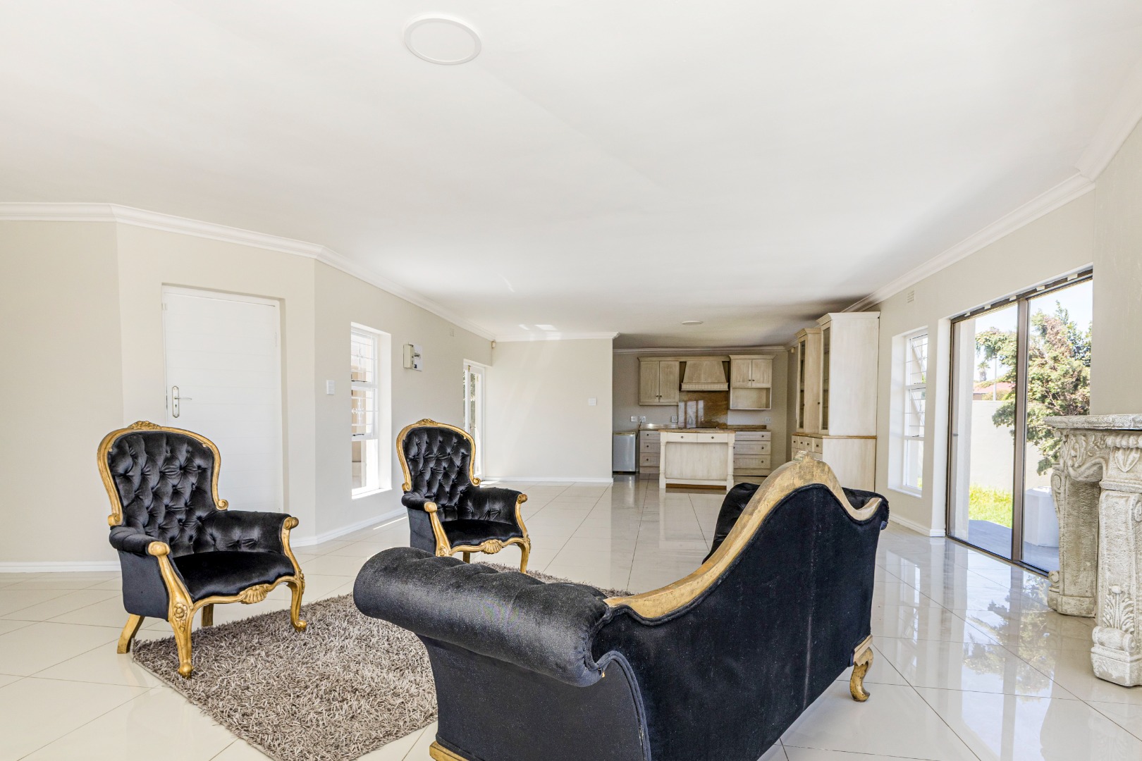 This inviting 3-bedroom, 2-bathroom home, including one en-suite, offers comfortable living in De Tijger, Parow. The residence features bright, open-plan living areas, comprising a lounge, dining room, and a dedicated family TV room, all adorned with glossy tiled flooring that enhances the natural light streaming through large windows and sliding doors. The functional kitchen is equipped with ample cabinetry and a built-in oven, ready for your culinary needs.